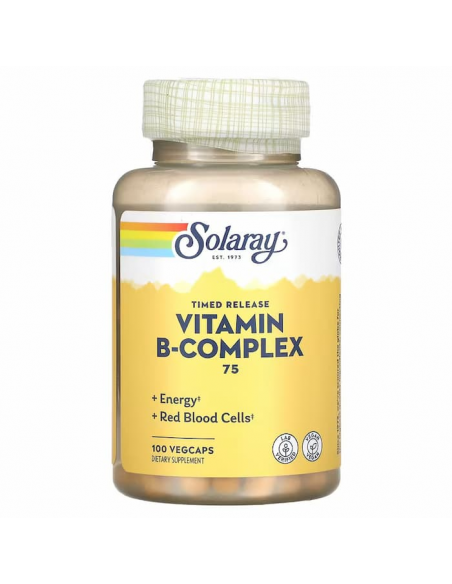 B-complex 75 de Solaray de cápsulas de acción retardada en dos etapas. En la primera etapa una porción del producto es liberada de forma rápida, el resto del producto se libera gradualmente en un período de 6-8 horas. Además contribuye para el buen funcionamiento del sistema digestivo, buen estado de la piel, el cabello y las uñas.