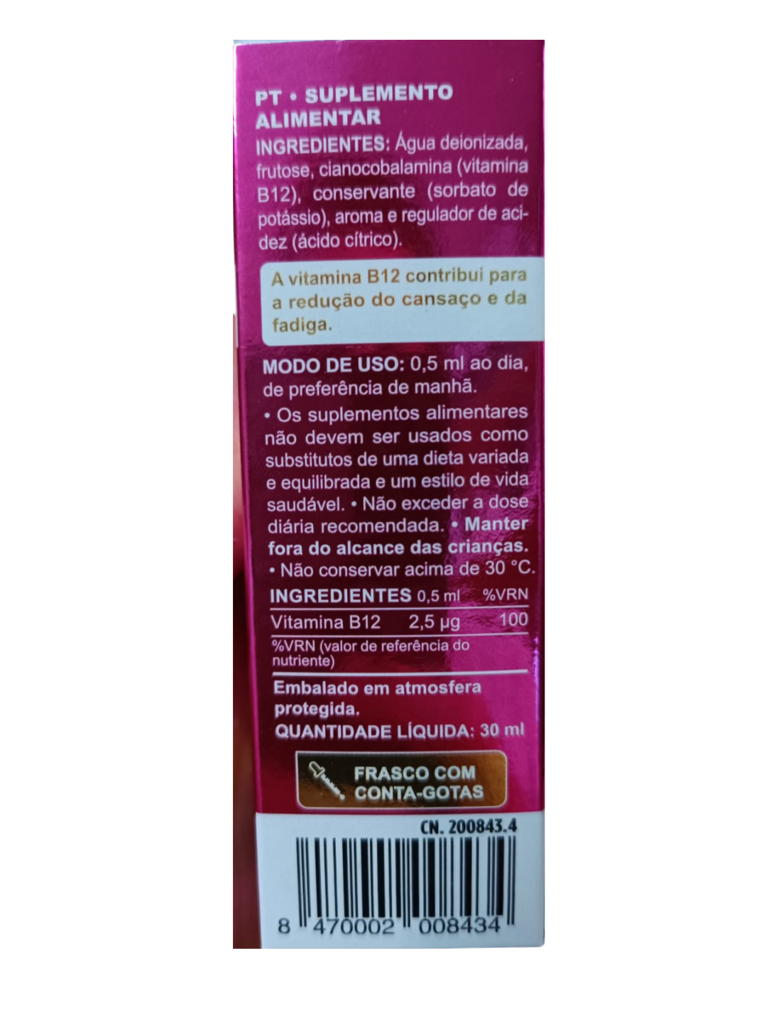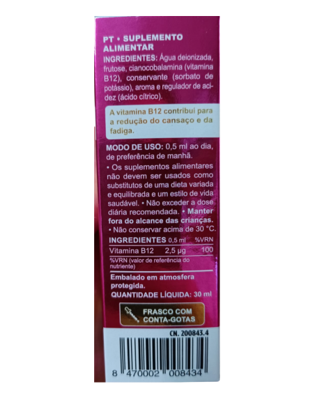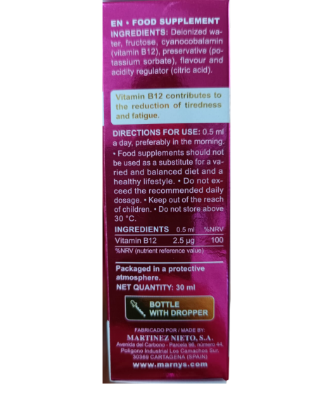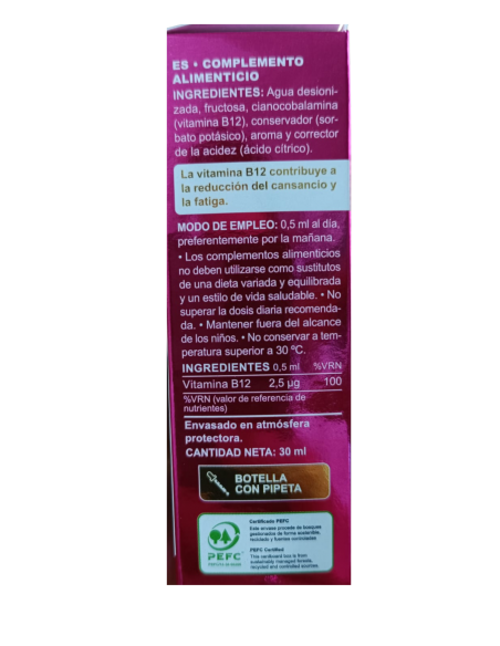 Complemento alimenticio con sabor frutal. La Vitamina B12, implicada en la división celular, contribuye a mantener la función normal del sistema inmune: a disminuir la fatiga y cansancio y a la formación normal de los glóbulos rojos: a la función normal del sistema nervioso, al metabolismo energético normal, al metabolismo normal de la homocisteína y a mantener las funciones fisiológicas normales.