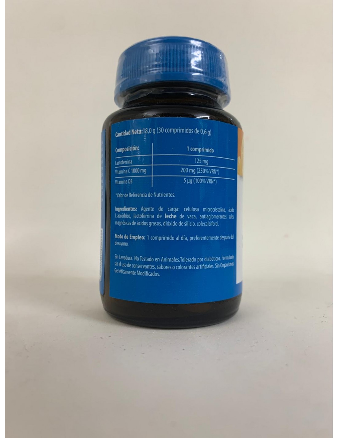 125 mg de lactoferrina. 200 mg de vitamina C. 5 mcg de vitamina D3