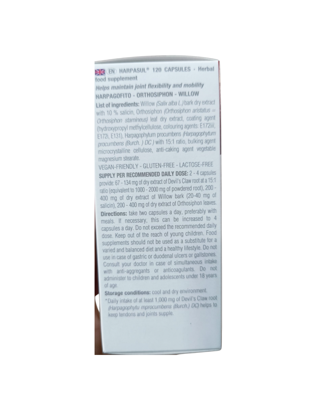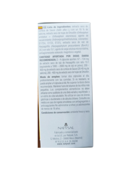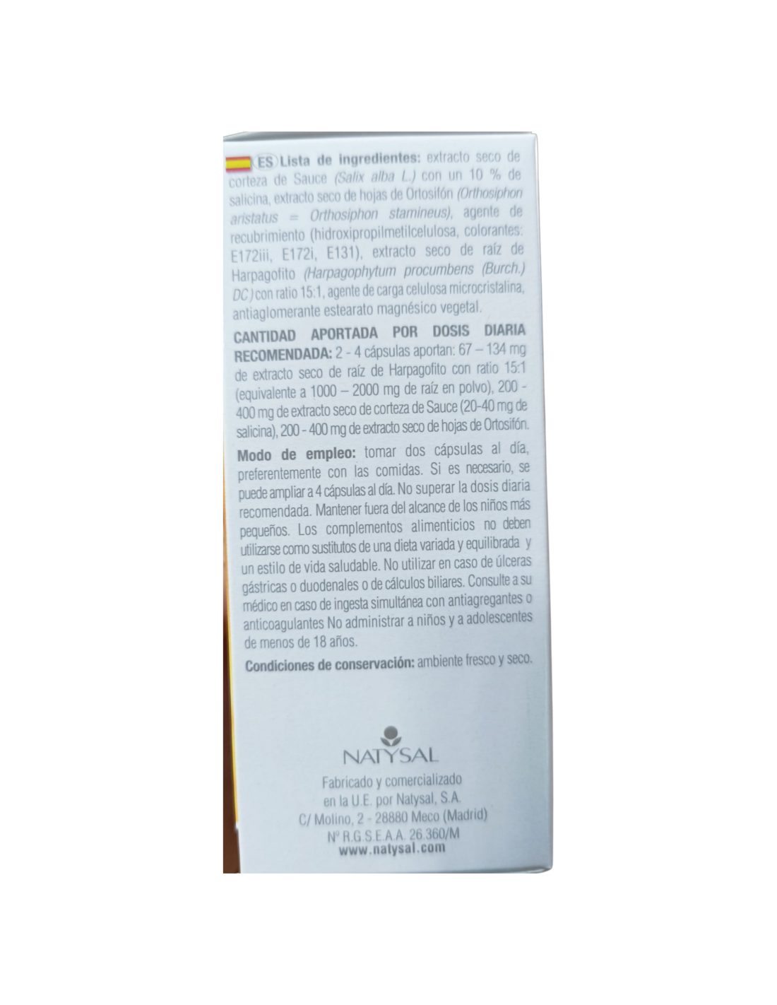 Extracto seco de raíz de Harpagofito (Harpagophytum procumbens (Burch.) DC) (3 % iridoides totales calculados como harpagósido), extracto seco de corteza de Sauce (Salix alba L.) (10 % derivados salicílicos totales calculados como salicina), extracto seco de hojas de Ortosifón (Orthosiphon anistatus (Bl.) Miq.(= Orthosiphon stamineus Benth.) (0,1 % sinensetina), agente de carga celulosa microcristalina, antiaglomerante estearato magnésico. Cubierta de la cápsula: gelatina, colorantes dióxido de titanio, óxido de hierro amarillo e índigo carmín FD&:C azul 2.