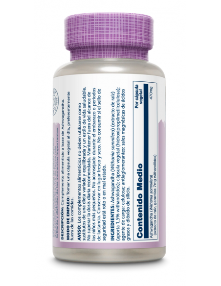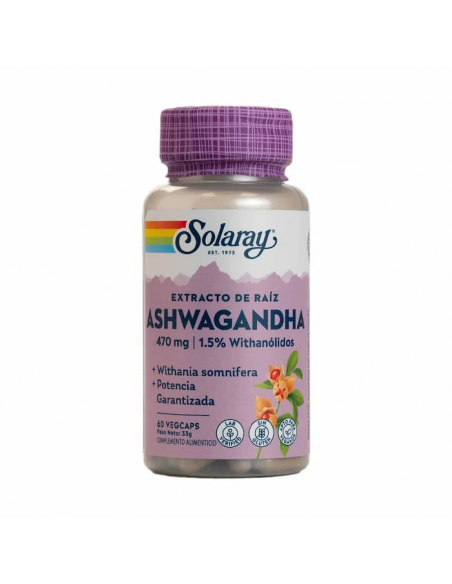 Ashwagandha de Solaray es una planta ayurvédica Al igual que el ginseng, Ashwagandha es una planta adaptogénica, es decir, ayuda al cuerpo a adaptarse a las diversas tensiones que sufre. El ingrediente activo buscado es withanolides, garantiza un mínimo de 1.5% por cápsula de 470 mg. También contiene muchos alcaloides como somniférina, somnina, whitamina y tropinas que ayudan a la relajación. La acción de Ashwagandha se realiza a nivel del hipocampo, la parte emocional y permite un retorno al equilibrio, la relajación. contribuye a la estimulación de los linfocitos.Es capaz de aumentar el rendimiento físico, la agudeza mental y la resistencia.