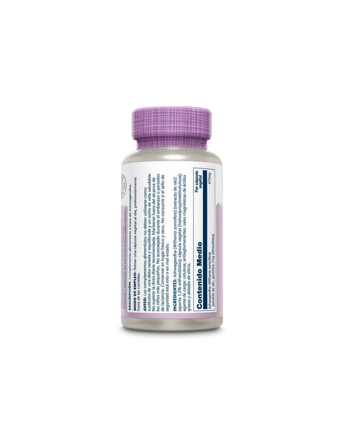 Ashwaghandha (Withania somnífera) (extracto de raíz estandarizado al 1.5% withanólidos), cápsula de celulosa vegetal, agente de carga:celulosa, antiaglomerante: estearato de magnesio, sílice.