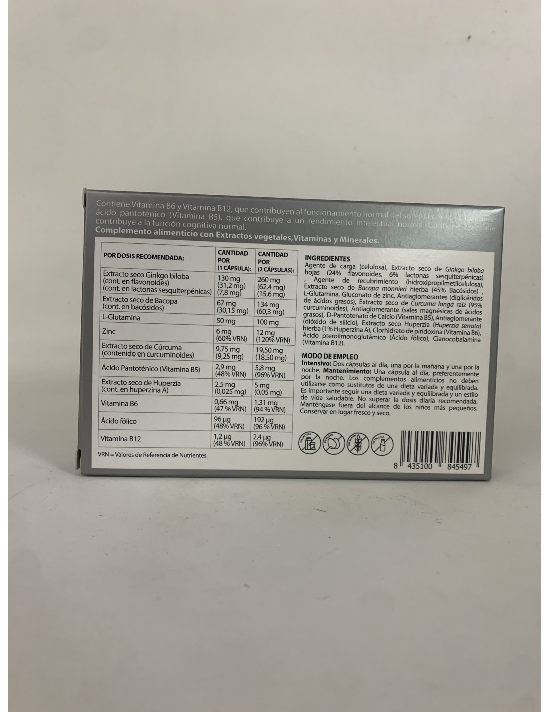 Agente de carga (celulosa), Extracto seco de Ginkgo biloba hojas (24% flavonoides, 6% lactonas sesquiterpénicas), Extracto seco de Bacopa monnieri hierba (45% Bacósidos), L-Glutamina, Gluconato de zinc, Antiaglomerantes (diglicéridos de ácidos grasos), Curcumina complexada (beta-ciclodextrina (humectante) y extracto de raíces de Curcuma longa, estandarizado en curcumina*), Antiaglomerantes (sales magnésicas de ácidos grasos), D-Pantotenato de Calcio (vitamina B5), Antiaglomerante (dióxido de Silicio), Extracto seco Huperzia (Huperzia serrata) hierba (1% huperzina A), Clorhidrato de piridoxina (vitamina B6), Ácido pteroilmonoglutámico (ácido fólico), Cianocobalamina (vitamina B12). Cobertura: Agente de recubrimiento (hidroxipropilmetilcelulosa).