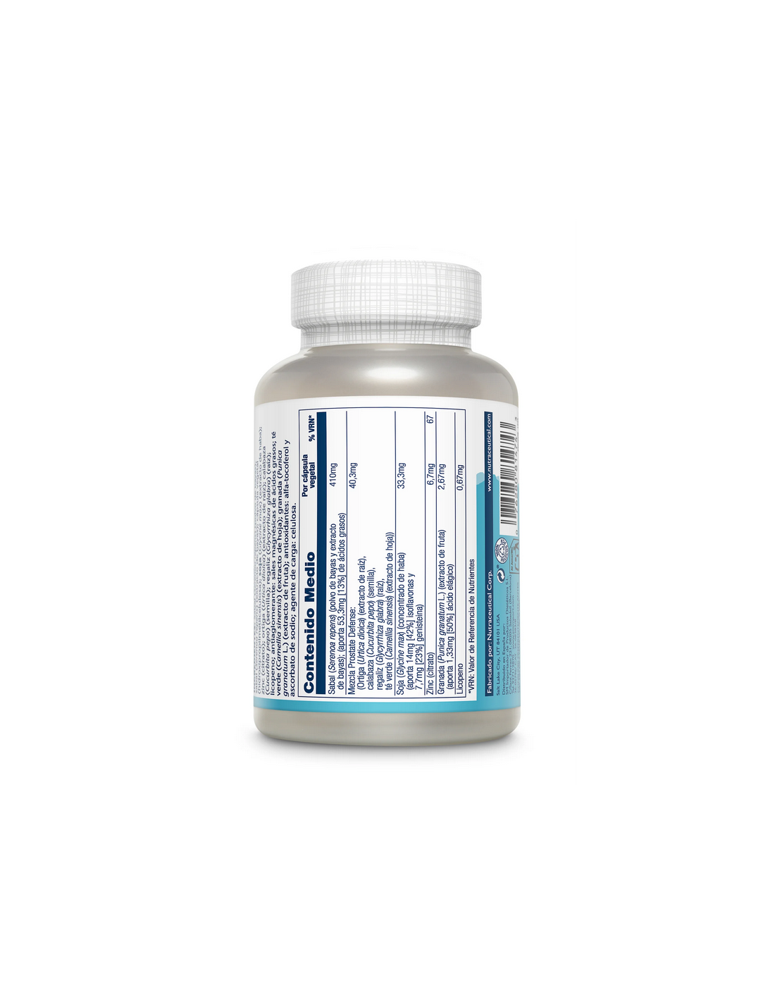 Cápsula de celulosa vegetal, sabal (Serenoa repens) (aceite de bayas)(aporta 11% ácidos grasos),mezcla Prostate Defense™:ortiga (Urtica dioca)(extracto de raíz), calabaza(Curcubita pepo) (semilla), regaliz (Glycirrhiza glabra)(raíz), crucíferas(indol-3-carbinol), té verde (Camellia sinensis) ( extracto de hoja), soja (Glycine max)(concentrado de haba)(aporta 40% isoflavonas totales y 20% genistéina), zinc (citrato), antiaglomerante: estearato de magnesio y celulosa, granada (ácido elágico), licopeno, agente de carga:almidón alimenticio.