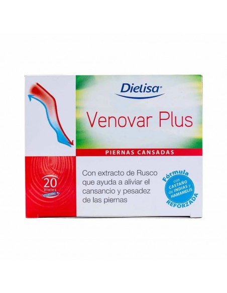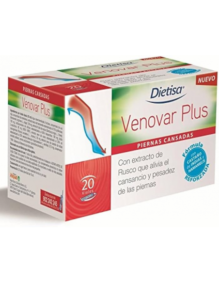 Venovar de Dietisa es un complemento alimenticio quealivia el cansancio y la pesadez de las piernasgracias a que está formado a base de arándano, rusco, saúco, castaño de indias, hamamelis, bioflavonoides de cítricos y vitaminas.