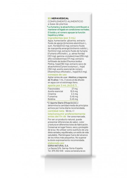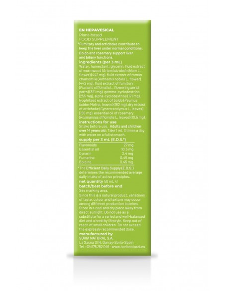 Agua, humectante: glicerina, extracto fluido de ajenjo (Artemisia absinthium L., sum. florida) (442 mg), extracto fluido de Manzanilla amarga (Anthemis nobilis L., flor) (442 mg), extracto fluido de Fumaria (Fumaria officinalis L., p. aérea florida) (321 mg), gamma-ciclodextrinas (255 mg), alfa-ciclodextrinas (171 mg), extracto liofilizado de boldo (Peumus boldus Molina, hoja) (162 mg), extracto seco de alcachofera (Cynara scolymus L., hoja) (150 mg), aceite esencial de romero (Rosmarinus officinalis L., hoja) (10,5 mg).
