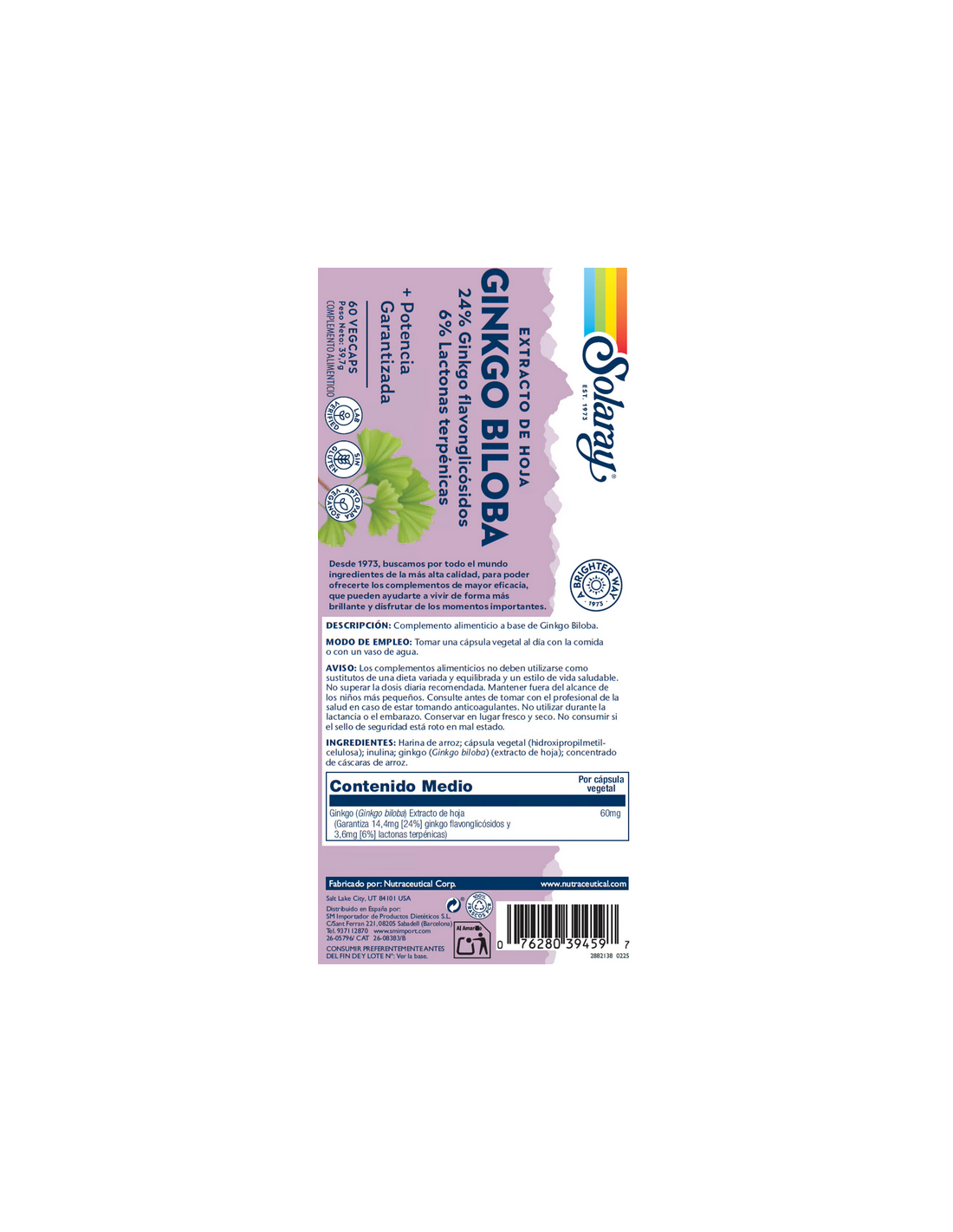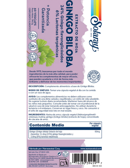 Ginkgo biloba de Solaray contiene todos los compuestos importantes, incluyendo ginkgólidos y bilobálidos.
