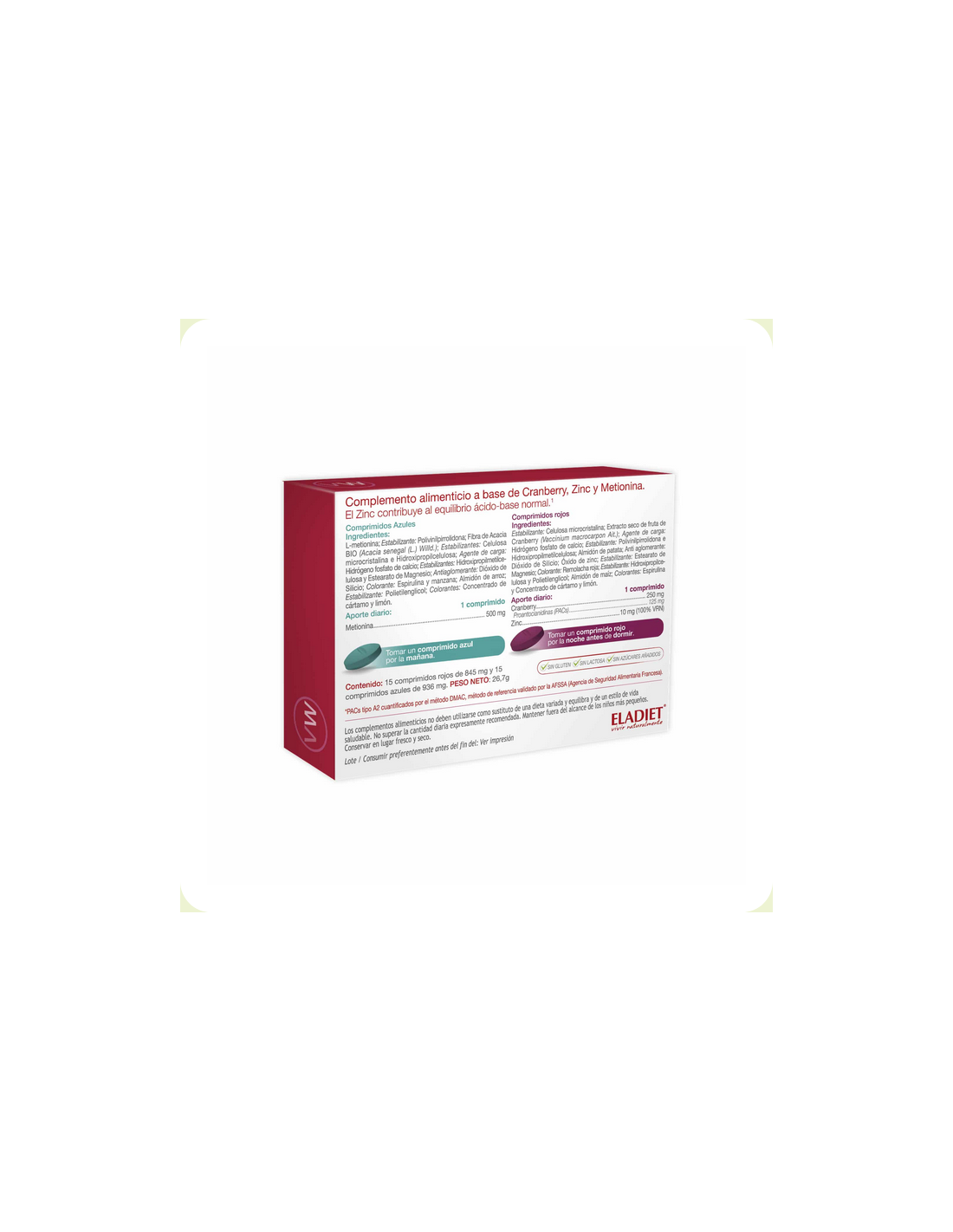 Comprimidos rojos: estabilizante: celulosa microcristalina: extracto seco de fruta de cranberry: agente de carga: hidrógeno fosfato de calcio: estabilizantes: polivinilpirrolidona e hidroxipropilmetilcelulosa: almidón de patata: antiaglomerante: dióxido de silicio, óxido de zinc: estabilizante: estearato de magnesio: colorante: remolacha roja: estabilizante: hidroxilpropolcelulosa y polietilglicol: almidón de maíz, colorantes: espirulina y concentrado de cártamo y limón.