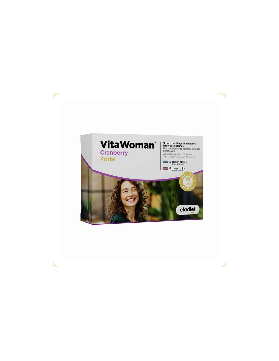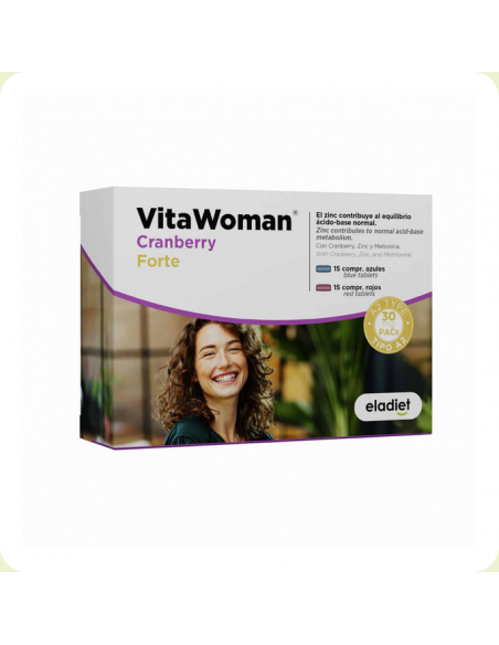 VitaWoman Cranberry Forte complemento que ayuda a mantener la salud de las vías urinarias. Es un complemento alimenticio a base de Cranberry, Zinc y Metionina en comprimidos de 2 tipos. El Zinc contribuye al equilibrio ácido-base normal.