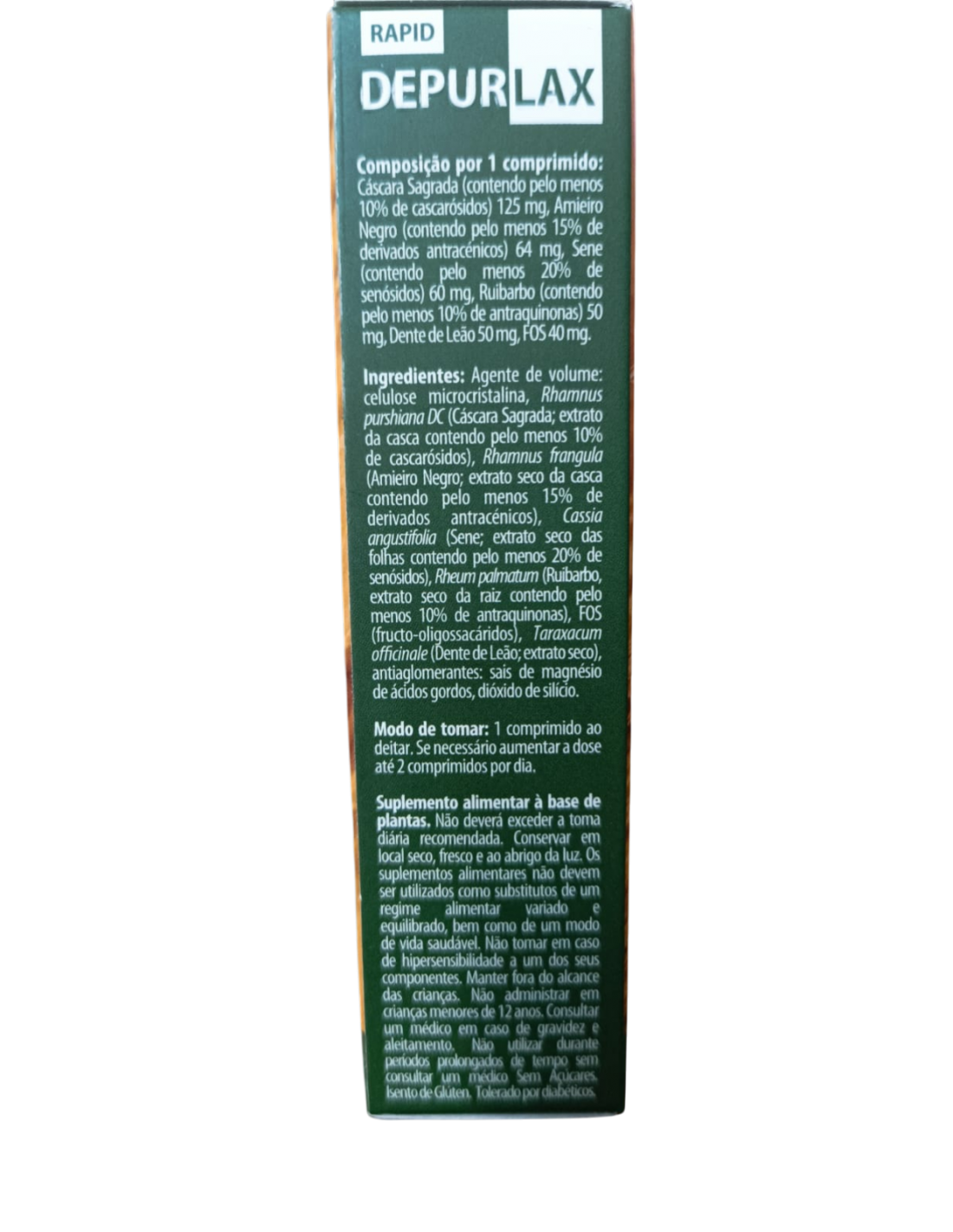 Agente de carga: celulosa microcristalina, Rhamnus purshiana DC (Cáscara Sagrada: extracto de la corteza conteniendo al menos 10% de cascarósido), Rhamnus frangula (Frángula: extracto seco de la corteza conteniendo al menos 15% de derivados antracénicos), Cassia angustifolia (Sen: extracto seco de las hojas conteniendo al menos 20% de senósidos), Rheum palmatum (Ruibarbo, extracto seco de la raíz conteniendo al menos 10% de antraquinona), FOS (fructooligosacáridos), Taraxacum officinale (Diente de León: extracto seco), antiaglomerantes: sales magnésicas de ácidos grasos, dióxido de silicio.