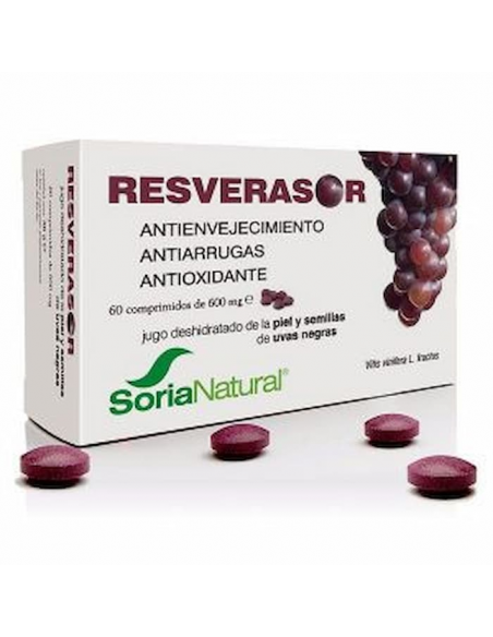 Resverasor de Soria Natural es uncomplemento de origen totalmente vegetalobtenido a partir de la piel y semillas de uvas negras, con una gran concentración y excelente calidad de sustancias antioxidantes (Resveratrol, Polifenoles, Antocianidinas, Procianidinas oligoméricas (OPCs), etc.).Este complemento actúa como unpotente antioxidantey, además,ayuda a evitar el envejecimiento prematuro de la piel.