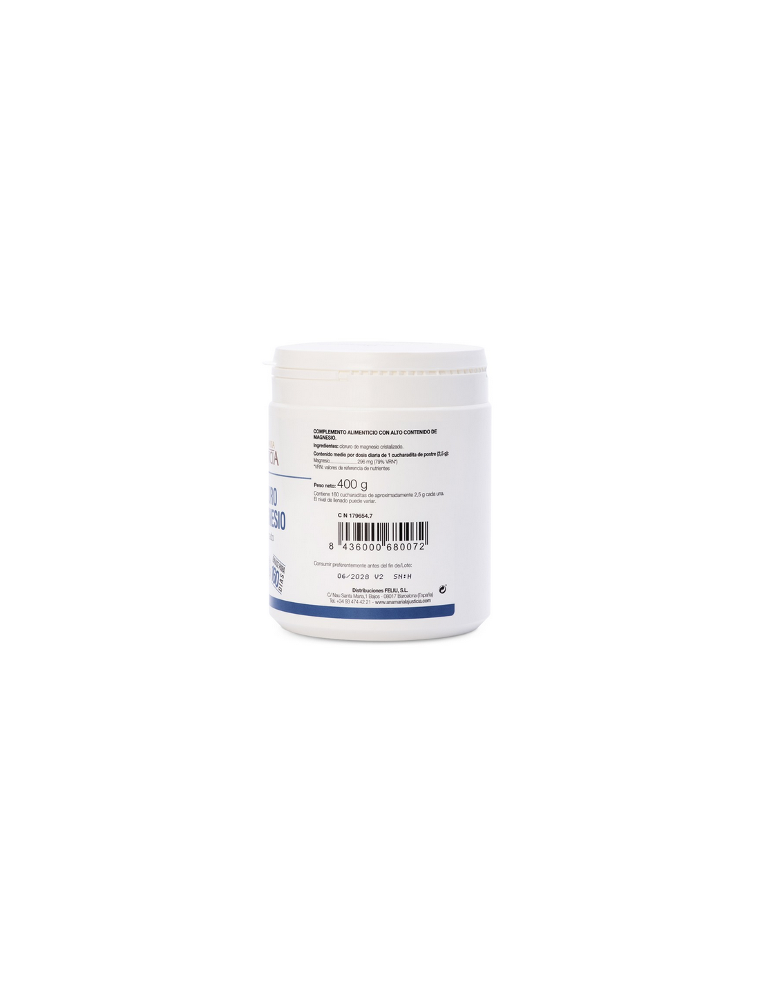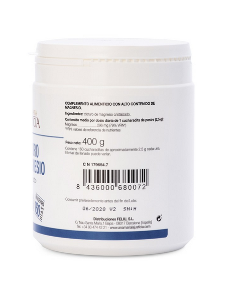 Cloruro de Magnesio Ana María La Justicia es un suplemento nutricional de alta calidad que proporciona una forma fácil de obtener los beneficios del cloruro de magnesio. El magnesio es un mineral que ayuda en el normal funcionamiento del cuerpo humano. Ayuda a disminuir el cansancio y la fatiga, al mismo tiempo que contribuye al equilibrio electrolítico, al metabolismo energético normal y al funcionamiento normal del sistema nervioso y de los músculos. Además, el magnesio es un factor importante en la síntesis proteica normal, la función psicológica normal y el mantenimiento de los huesos y dientes en condiciones normales. No obstante, los beneficios de cloruro de magnesio no se detienen ahí, este mineral también tiene un impacto significativo en el proceso de división celular, lo que lo convierte en un nutriente vital para la regeneración celular y el mantenimiento de la función celular. Además, debido a sus propiedades laxantes, el magnesio puede ayudar en el estreñimiento y otros trastornos gastrointestinales.