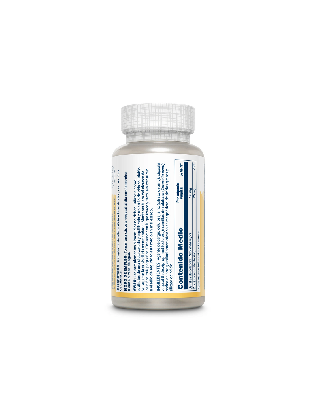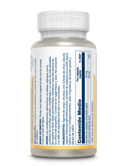 Agente de carga: celulosa, zinc (citrato), cápsula de celulosa vegetal: concentrado de arroz integral, semilla de calabaza (Curbubita pepo), antiaglomerante: estearato de magnesio, calcio silicato.
