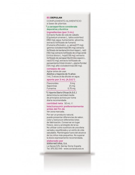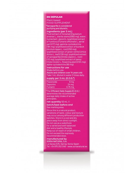 Extracto fluido de cola de caballo (Equisetum arvense L, tallos estériles) (950 mg), agua, humectante: glicerina, extracto liofilizado de fumari (fumaria officinalis L., p. aérea) (171 mg), gamma-ciclodextrinas (164 mg), extracto liofilizado de bardana (Arctium lappa L, raíz) (150 mg), extracto liofilizado de ortiga verde (urtica dioica L, hoja) (138 mg), extracto liofilizado de zarzaparrilla (smilax aspera L, raíz) (112 mg), extracto liofilizado de pensamiento (viola tricolor L, planta florida(104 mg), alfa-ciclodextrinas (90 mg).