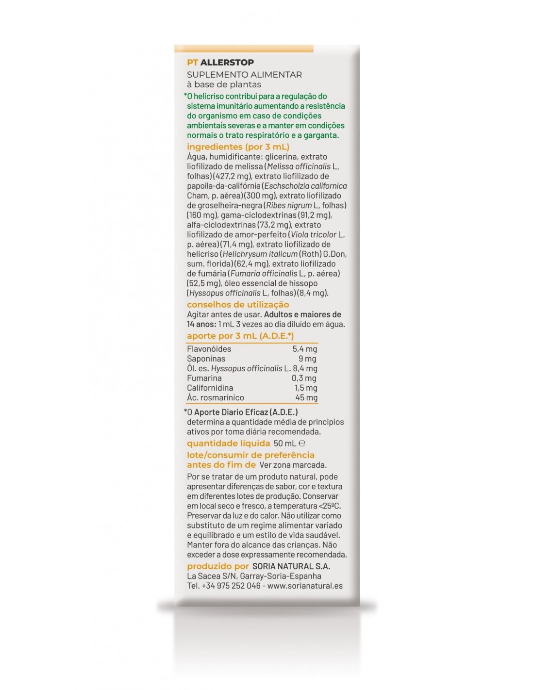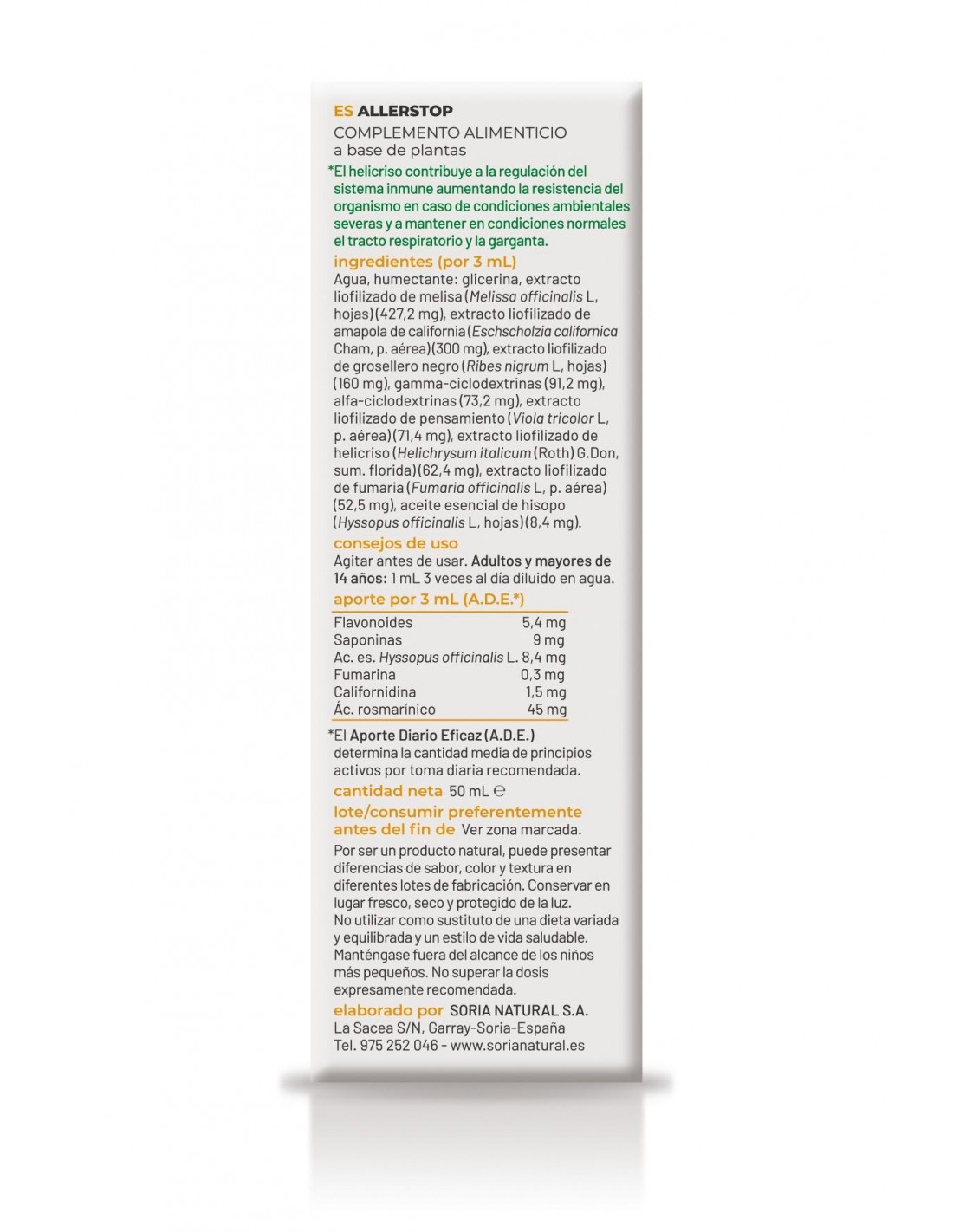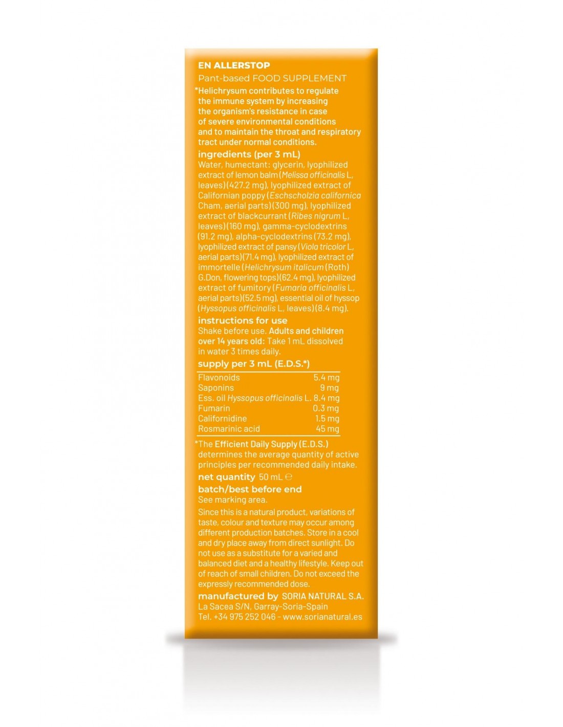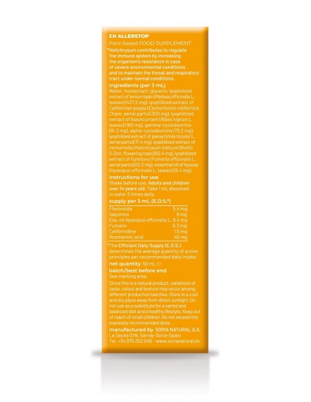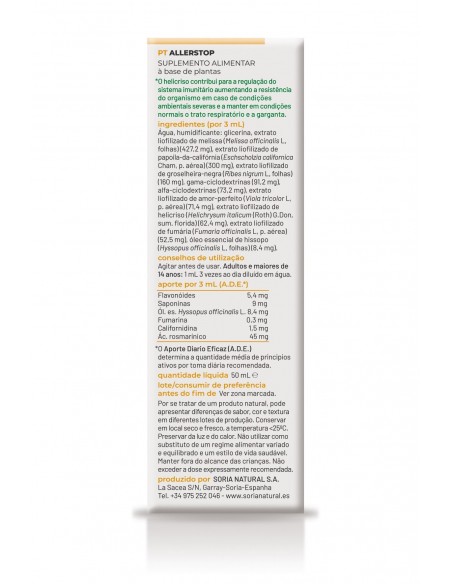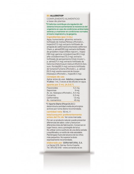 Agua, humectante: glicerina, extracto liofilizado de Melisa (Melissa officinalis L., hojas) (427,2 mg), extracto liofilizado de amapola de california (Eschscholzia californica Cham, p. aérea) (300 mg), extracto liofilizado de grosellero negro (Ribes nigrum L., hojas) (160 mg), gamma-ciclodextrinas (91,2 mg), alfa-ciclodextrinas (73,2 mg), extracto liofilizado de pensamiento (Viola tricolor L., p. aérea) (71,4 mg), extracto liofilizado de helicriso (Helichrysum italicum (Roth) G. Don, sum. florida) (62,4 mg, extracto liofilizado de fumaria (Fumaria officinalis L., p. aérea)(52,5 mg), aceite esencial de hisopo (Hyssopus officinalis L., hojas) (8,4 mg).