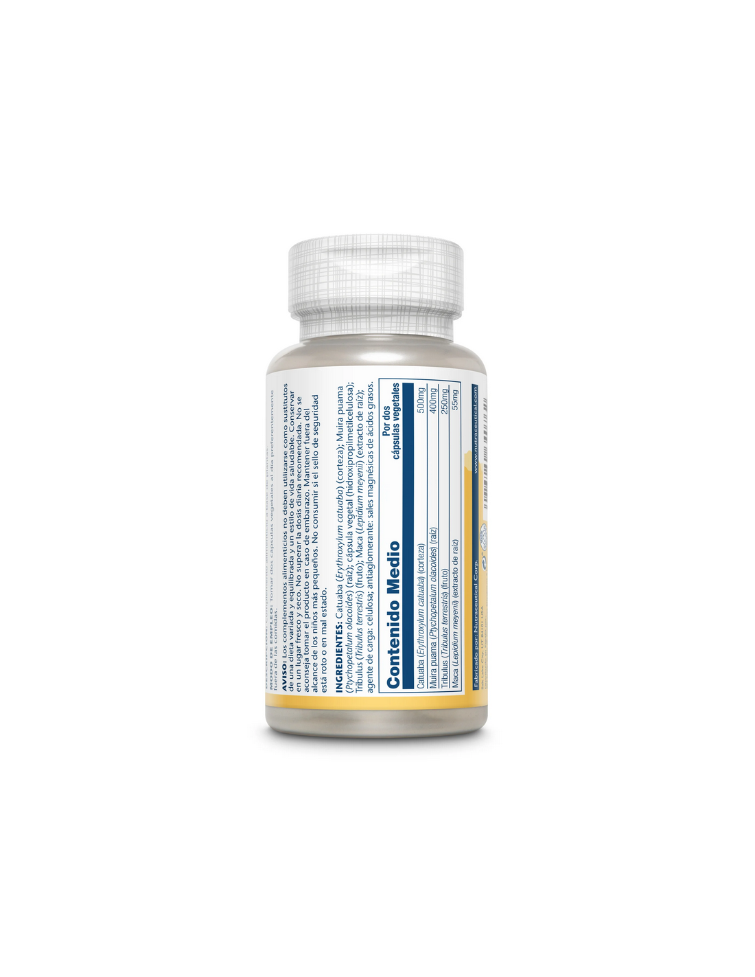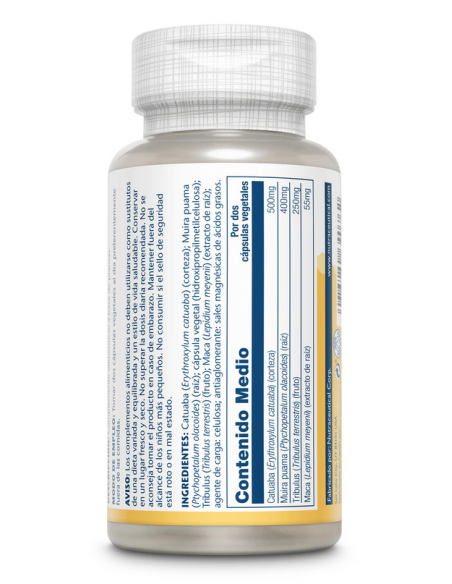 Catuaba (Erythroxylum catuaba)(corteza), Muira puama (Ptychopetalum olacoides (raíz), cápsula de celulosa vegetal, Tirbulus (Tribulus terrestris) (fruto), Maca (Lepidium meyenii) (extracto de raíz), antiaglomerante: celulosa, estarato de magnesio.