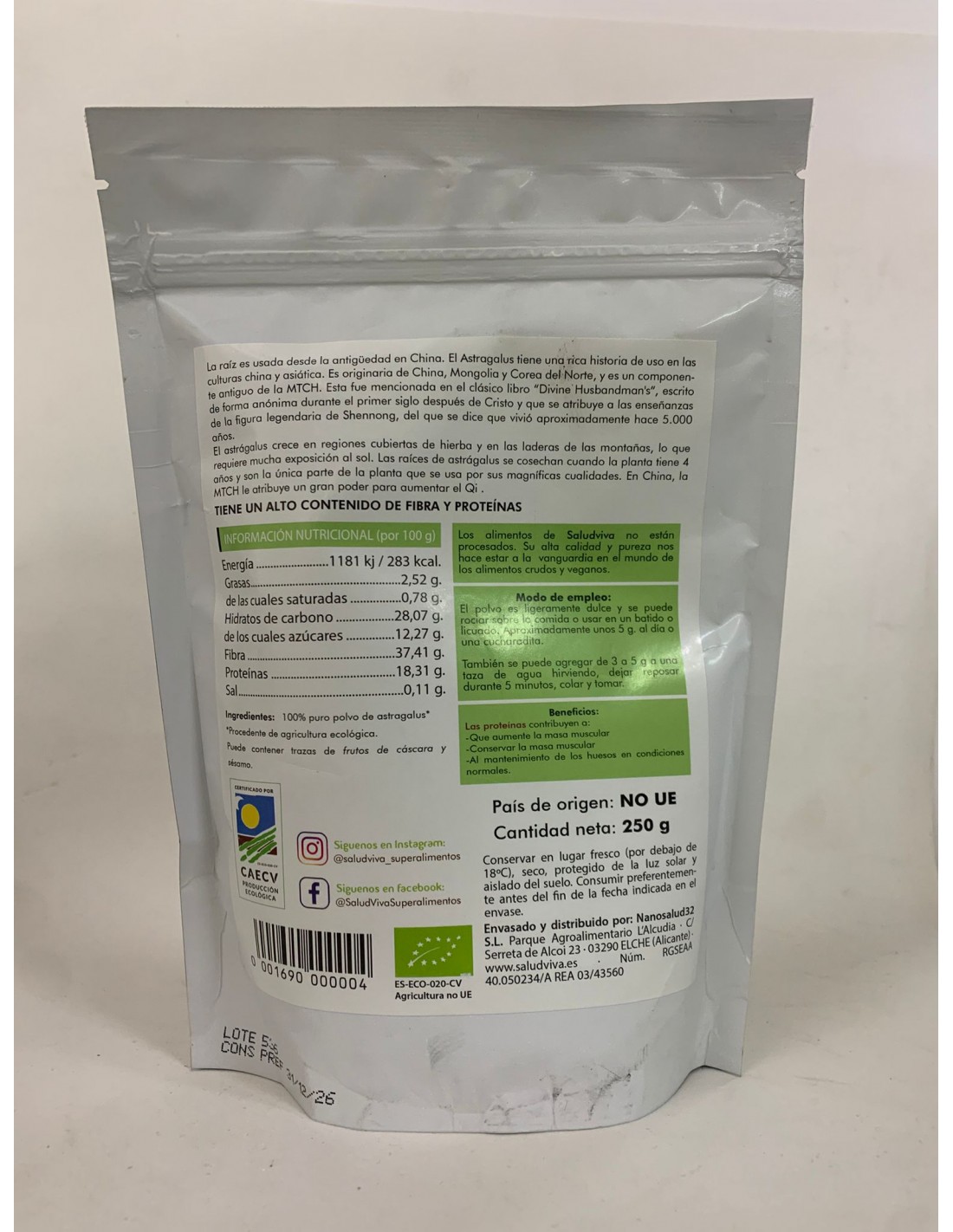 100% puro polvo de astragalus procedente de agricultura ecológica.\ \ Valor nutricional por 100 g:\ Energía....................................1181 kj / 283 kcal.\ Grasas.......................................................2,52 g.\ de las cuales saturadas.........................0,78 g.\ Hidratos de carbono.............................28,07 g.\ de los cuales azúcares........................12,27 g.\ Fibra.........................................................37,41 g.\ Proteínas................................................18,31 g.\ Sal..............................................................0,01 g.\ \ *Puede contener trazas de fruto de cáscara y sésamo.