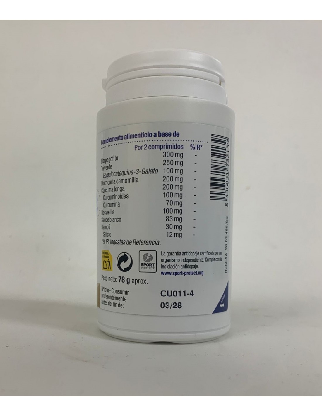 Extracto seco de Harpagofito (Harpagophytum procumbens (Burch.) DC., 2% Harpagosidos), celulosa microscristalina y fosfato bicálcico dihidratado, extracto seco de Té verde (Camellia sinensis (L.) Kuntze, 95% polifenoles, 70% catequinas, 40% EGCG (Epigalocatequina-3-Galato), extracto seco de Matricaria camomilla (Matricaria recutita L., 1% flavonas), extracto seco de Cúrcuma longa (Curcuma longa L., 50% curcuminoides), extracto seco de Boswellia (Boswellia serrata Roxb. Ex Colebr, 10% ácidos boswélicos) y extracto seco de Sauce blanco (Salix alba L., 25% Salicina), estearato de magnesio y dióxido de silicio.