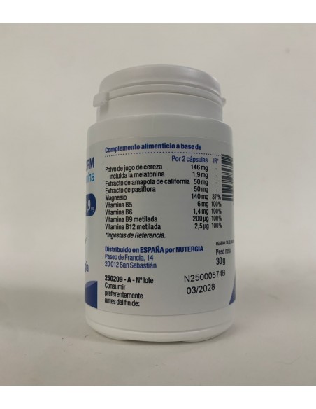 Polvo de cereza (Prunus cerasus L.) estandarizado en melatonina, polvo de eschscholtzia (Eschscholtzia californica Cham.), magnesio marino (óxido de magnesio), antiaglomerantes: fosfato dicálcico y lecitina de soja, extracto de pasiflora (Passiflora incarnata L.), vitaminas B5, B6, B9 y B12.