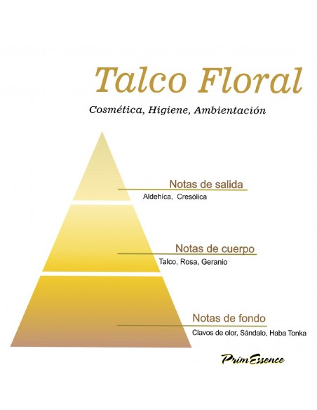La esencia de Talco floral, es como bien ya su nombre indica, una esencia floral con notas frescas y matices amaderados, así es laesencia talco floralde PrimEssence. En ella encontrarás notas tales como geranio, rosa, sándalo... combinadas con la aromatización y el frescor de los clavos de olor y la calidez y sensualidad de la Haba Tonka. Se trata de una esencia irresistible, envolvente y muy delicada. Con ella podráshacer todo tipo de productos de ambientaciónde forma fácil y rápida, además, te servirá para darle un agradable aroma a tus productos de higiene caseros como bombas de baño,jabones, ambientadores y además podrás utilizarlo para crear cosméticos como cremas, mascarillas... Es concentrada y muy versátil.