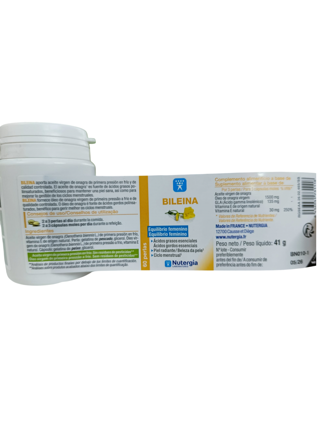 Bileina de 60 perlas, es un suplemento alimenticio compuesto exclusivamente por aceite de onagra, el cual se obtiene mediante un proceso de prensado mecánico en frío para garantizar la conservación de sus propiedades naturales.
