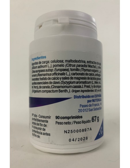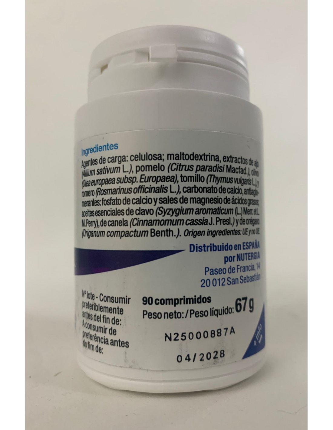 Celulosa, extractos de olivo, tomillo y romero, polvo de ajo, maltodextrina, carbonato de calcio, extractos de pomelo, aceite esencial de clavo, canela y orégano, sílice, estearato de magnesio.
