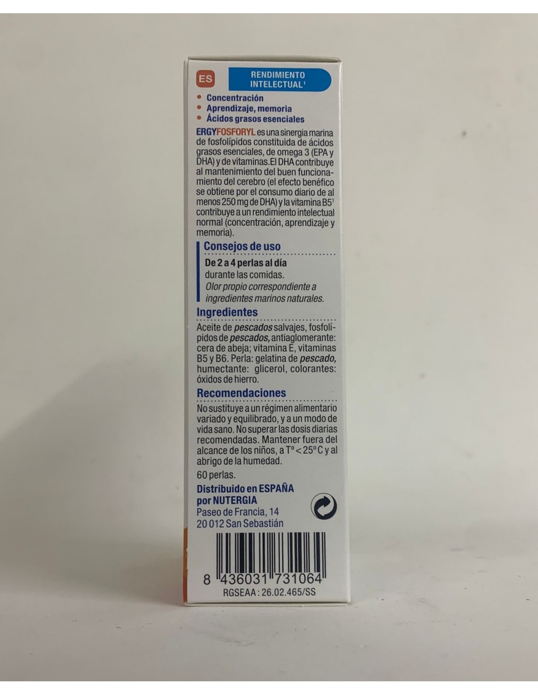 Ergyfosforyl es rico en vitamina B5, que es útil para ayudar a la memoria y concentración en diferentes situaciones, como la preparación para exámenes escolares y universitarios, ya que contribuye al rendimiento intelectual normal como el aprendizaje, la memorización, y el razonamiento. El DHA ayuda al funcionamiento normal del cerebro. Los fosfolípidos y el omega 3, son componentes cruciales de las membranas celulares que rodean las neuronas. Estos compuestos ayudan a mantener la integridad y la comunicación entre las células cerebrales.