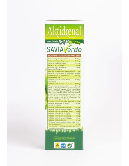 Mezcla exclusiva de extractos secos de frutas y verduras (Brécol, Té Verde, Pomelo, Arándano, Naranja roja, Col verde, Guaraná, Cebolla, Ajo, Naranja, Papaya, Piña, Fresa, Manzana, Albaricoque, Cerezo, Olivo, Grosellero negro, Pepino, Espárrago, Uvas rojas y Uvas blancas) 200 mg que aporta Vitamina B3 (Niacina) ....3,6 mg