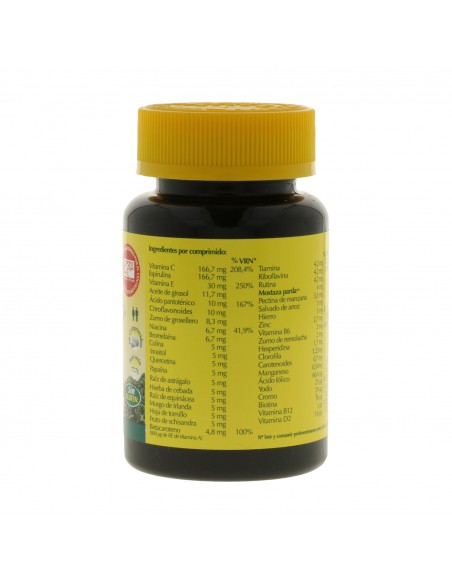 Agente de carga (celulosa microcristalina), Vitamina C (ácido L-ascórbico), Espirulina (Spirulina platensis), Agente de carga (celulosa vegetal), Citrato de magnesio*, Antiaglomerante (fosfato dicálcico), Citrato de calcio*, Antiaglomerante (estearato de magnesio), Betacaroteno al 10%, Carbonato de calcio*, Vitamina E (succinato ácido de D-alfa-tocoferilo), Óxido de magnesio*, Antiaglomerante (ácido esteárico), Bitartrato de colina, Aceite de girasol (Helianthus annuus), D-Pantotenato cálcico, Citroflavonoides (Citrus limon, Citrus sinensis), Gluconato de hierro, Zumo de grosellero negro (Ribes nigrum), Citrato de zinc, Niacinamida, Bromelaína, Ananas comosus, Fumarato de hierro, Extracto de raíz de astrágalo (Astragalus membranaceus), Extracto de raíz de equinácea (Echinacea angustifolia), Hoja de tomillo (Thymus vulgaris), Extracto de frutos de Schisandra (Schisandra sinensis), Inositol, Quercetina, Papaína (Carica papaya), Antiaglomerante (dióxido de silicio), Agente de recubrimiento (goma laca), Vitamina B1 (tiamina HCl), Vitamina B2 (riboflavina), Rutina (sophora japonica), Salvado de arroz (Oryza sativa), Mostaza parda (Brassica juncea), Pectina de manzana (Malus sylvestris), Clorofila (de Spirulina platensis, Morus spp.), Citrato de manganeso, clorhidrato de piridoxina, zumo de remolacha (Beta vulgaris), Hesperidina (Citrus limon), Biotina, Vitamina D2 (ergocalciferol), Carotenoides, Vitamina B12 (cianocobalamina), cloruro de cromo, ácido pteroilmonoglutámico, yoduro potásico.