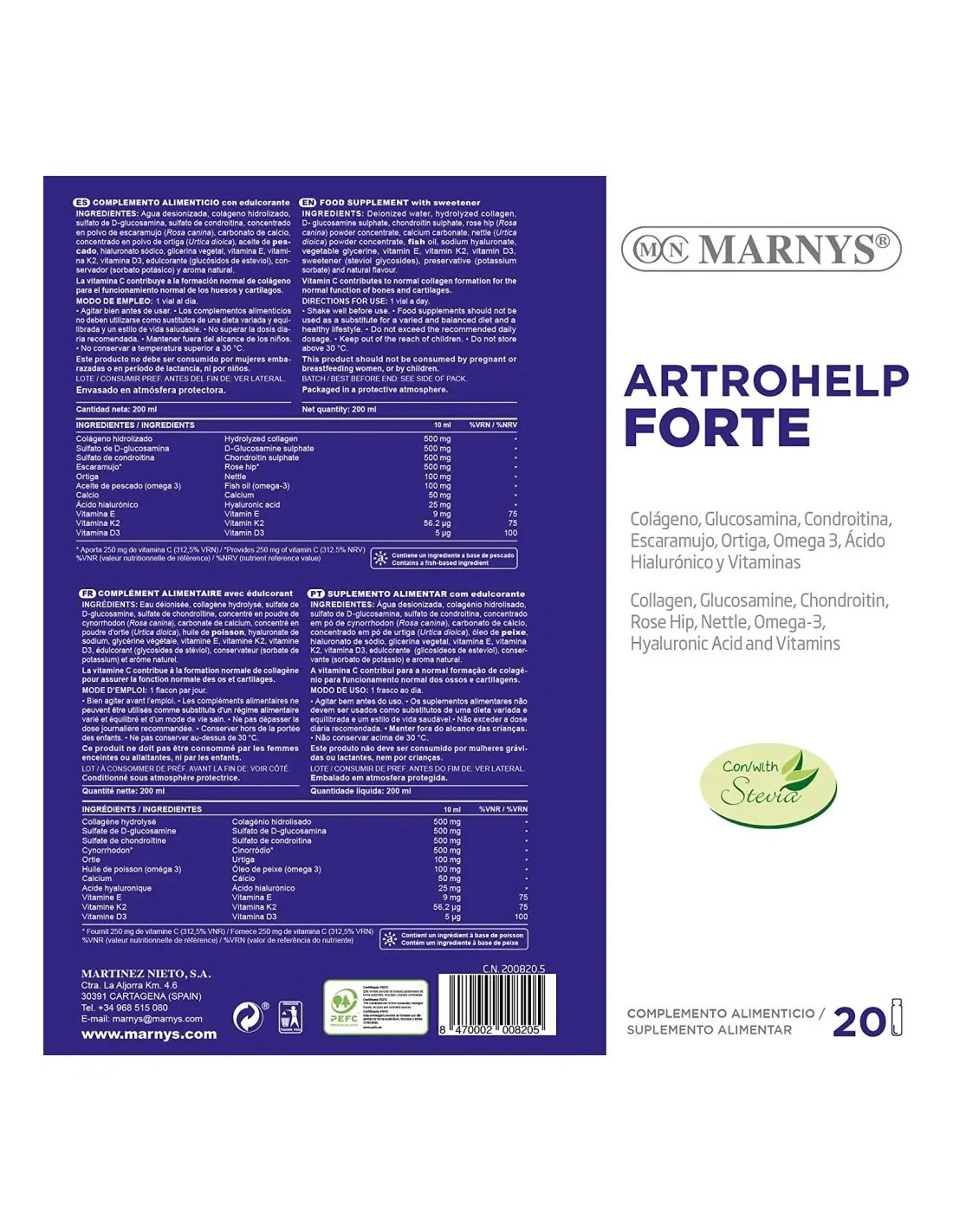 Por vial: Colágeno Hidrolizado 500 mg, Glucosamina 500 mg, Condroitina 500 mg, Escaramujo 500 mg, ortiga 100 mg, Omega 3 100mg, calcio 50 mg, ácido hialurónico 25 mg, Vitamina E 9 mg, Vitamina K2 56,2 µg, Vitamina D3 5 µg.