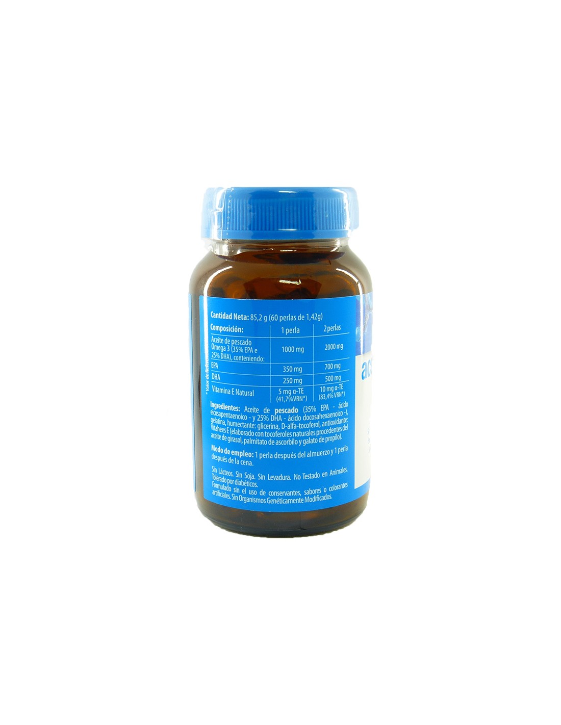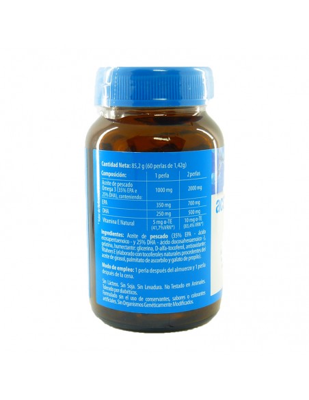 Aceite de pescado Omega 3 2000 mg (35% EPA y 25% DHA), conteniendo: EPA 700 mg, DHA 500 mg, Vitamina E Natural 10 mg a-TE (83,4% VRN*).