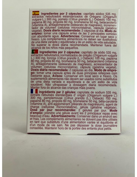 Caprilato sódico 535 mg, extractos nebulizados estandarizados de Orégano (Origanum vulgare L.) 300 mg, pomelo (Citrus grandis (L.) Osbeck) 100 mg, papaína 80 mg, própolis 60 mg, bromelaína 50 mg, betacaroteno (Vitamina A), antiaglomerante (estearato de magnesio), incrementador de volumen (celulosa microcristalina) y envoltura (gelatina).