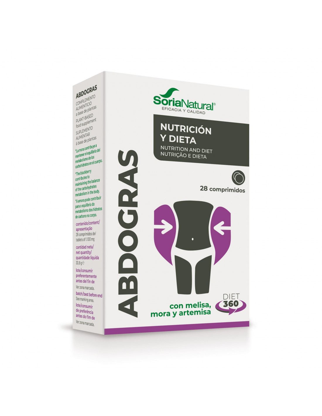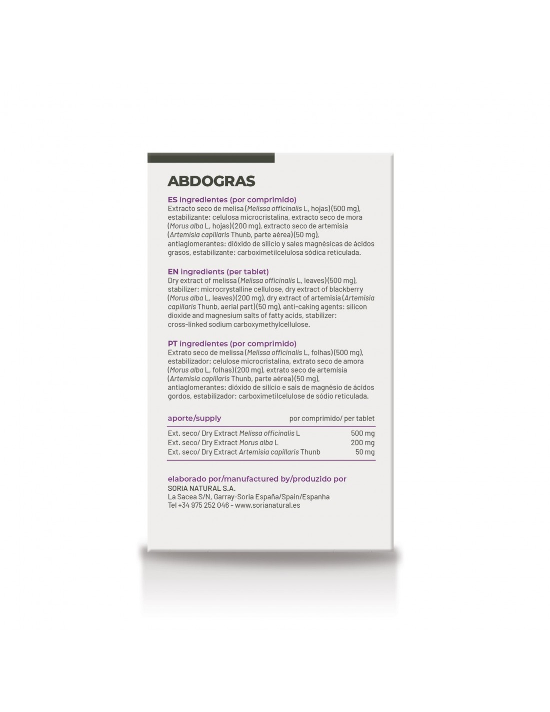 Extracto seco de Melisa (Melissa officinalis L., hojas) (500 mg), estabilizante: celulosa microcristalina, extractos seco de Mora (Morus alba L, hojas) (200 mg), extracto seco de Artemisa (Artemisia capillaris Thunb, parte aérea) (50 mg): estabilizante: carboximetilcelulosa sódica reticulada: antiaglomerante: sal magnésica de ácidos grasos.
