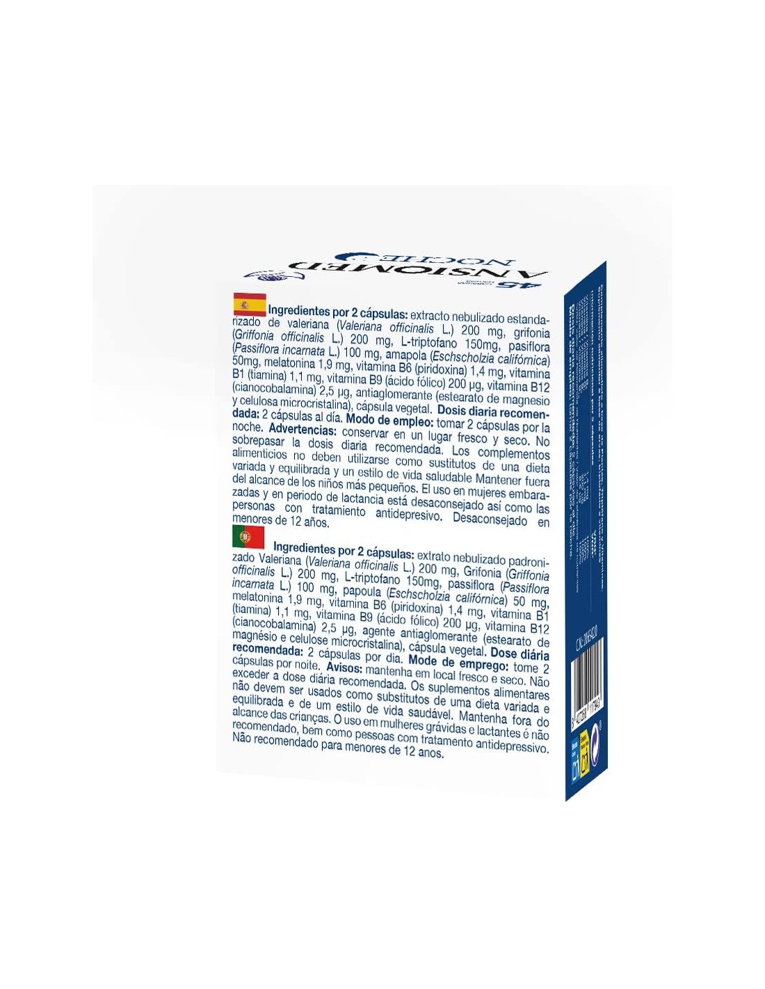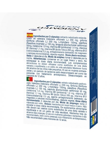 Esta fórmula está compuesta porextractos de griffonia valorada al 20% en 5HTP (5-hidroxitriptófano), valeriana, pasiflora, amapola, melatonina y vitaminas del grupo B.