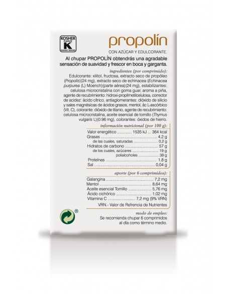 Por comprimido: Edulcorante: xilitol , fructosa, extracto seco de propóleo (Propolis) (24 mg), extracto seco de echinacea (Echinacea purpurea (L) Moench) (parte aérea) (24 mg), estabilizantes: celulosa microcristalina, aroma a piña, corrector de acidez: ácido cítrico , antiaglomerante: dióxido de silicio, colorante: riboflavina, agente de recubrimiento: hidroxipropilmetil celulosa e isomaltosa, antiaglomerante: sales magnésicas de ácidos grasos, estabilizante: goma guar, mentol, ácido L-ascórbico (Vit. C), aceite esencial de tomillo (Thymus vulgaris L.) (0.96 mg), colorantes: carbonato de calcio y carmín.