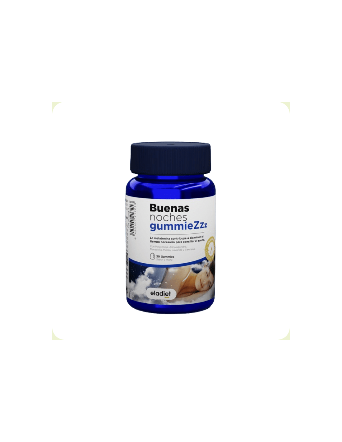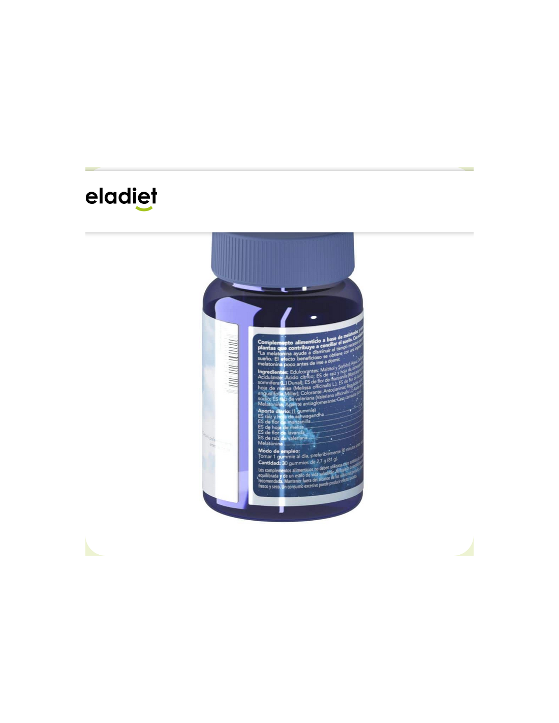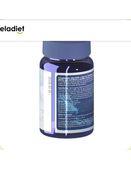 Edulcorantes: Maltitol y Sorbitol: Agua, Gelificante: pectin: Acidulante: Ácido cítrico: Extracto seco de raíz y hoja de ashwagandha (Withania somnifera (L.) Dunal): Extracto seco de flor de manzanilla (Matricaria recutita L.): Extracto seco de hoja de melisa (Melissa officinalis L.): Extracto seco de flor de lavanda (Lavandula angustifolia Miller): Colorante: Antocianinas: Regulador acidez: citratos de sodio: Extracto seco raíz de valeriana (Valeriana officinalis L.): Aceite de coco: Aroma: Melatonina: Agente antiaglomerante: Cera carnauba (coco)