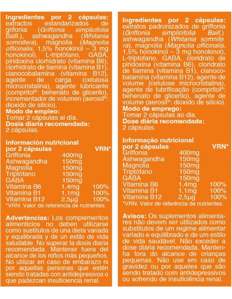 Por 2 cápsulas:\ Extractos estandarizados de:\ Griffonia (Griffonia simplicifolia Baill.) (5% HTP) 400 mg\ Ashwagandha (Whitania somnifera) (5% withanolidos) 150 mg\ Magnolia (Magnolia officinalis) (1,5% honokinol – 3 mg honokinol) 150 mg\ Triptófano 150 mg\ GABA 150 mg\ Vitamina B6 1,4 mg \ Vitamina B1 1,1 mg \ Vitamina B12 2,5 µg