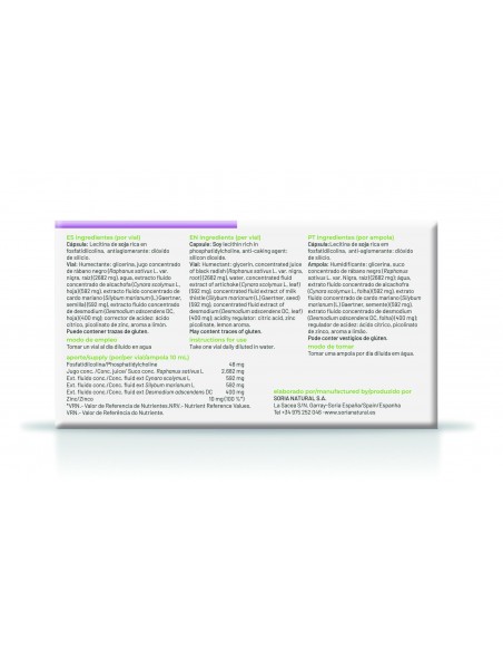 Vial: Humectante: glicerina, jugo concentrado de rábano negro (Raphanus sativus L. var. nigra, raíz) (2682 mg), agua, extracto fluido concentrado de alcachofa (Cynara scolymus L., hoja) (592 mg), extracto fluido concentrado de cardo mariano (Silybum marianum (L) Gaertner, semilla) (592 mg), extracto fluido concentrado de desmodium (Desmodium adscendens DC, hoja) (400 mg); corrector de acidez: ácido cítrico, picolinato de zinc, aroma a limón.