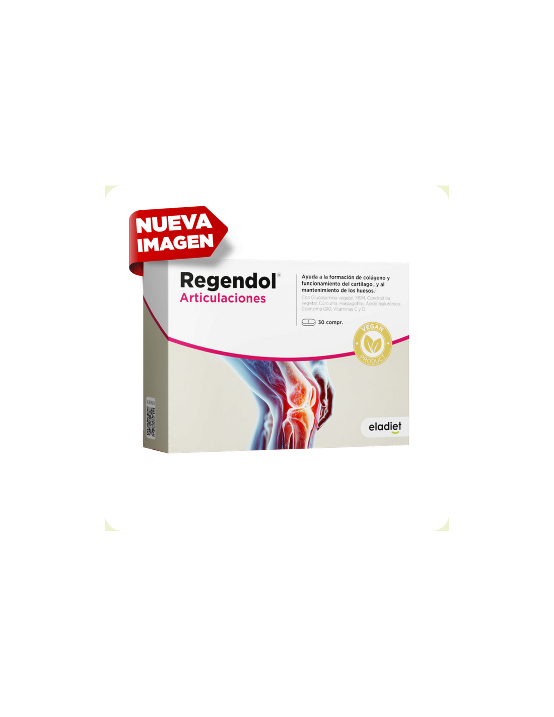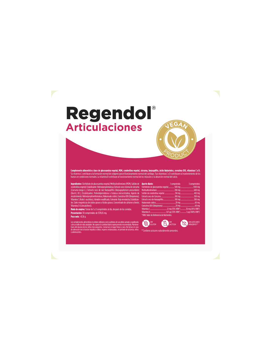 INGREDIENTES: Por 1 comprimido: Glucosamina vegetal (500 mg); Metilsulfonilmetabo (200 mg); Sulfato de condroitina vegetal (134 mg); Extracto seco de cúrcuma (100 mg); Extracto seco de Harpagofito (100 mg); Ácido hialurónico (20 mg); Coenzima Q10 (20 mg); Vitamina C (12 mg, 15% VRN); Vitamina D (1,67 mcg, 33% VRN).