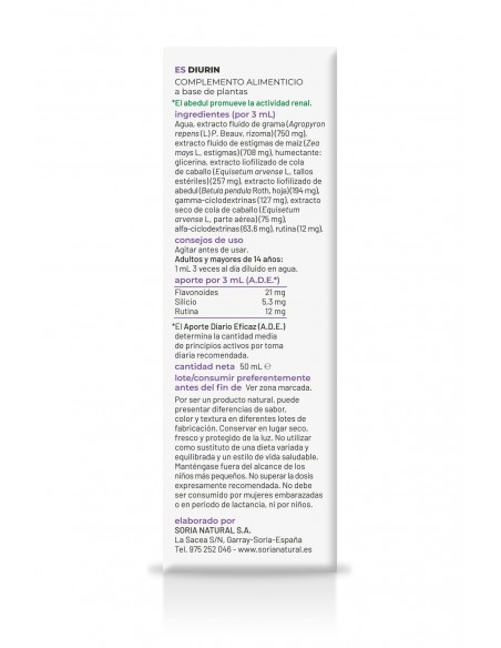 Agua, extracto fluido de Grama, extracto fluido de Estigmas de maíz, conservador: glicerina, extracto liofilizado de Cola de Caballo, extracto liofilizado de Abedul, gamma-ciclodextrinas, fracción mineral de Cola de caballo, alfa-ciclodextrinas, rutina.