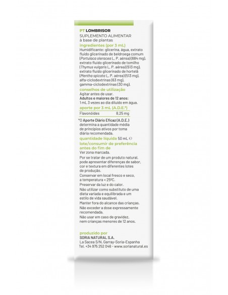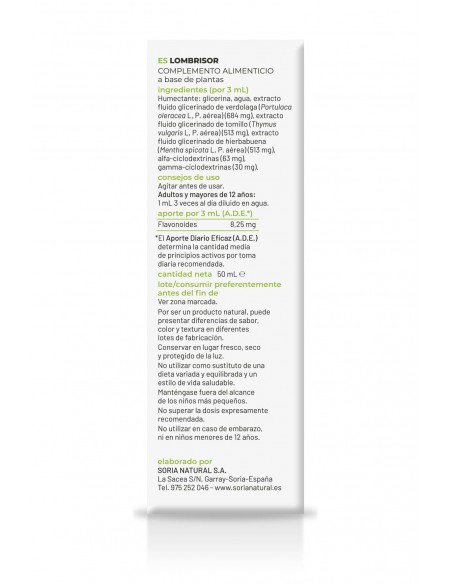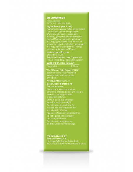 (por 3 mL) Humectante: glicerina, agua, extracto fluido glicerinado de tomillo (Thymus vulgaris L., P. aérea) (477 mg), extracto fluido glicerinado de hierbabuena (Mentha spicata L., P. aérea) (477 mg), jugo liofilizado de verdolaga (Portulaca oleracea L., P. aérea) (153 mg), alfa-ciclodextrinas (63 mg), gamma-ciclodextrinas (30 mg).