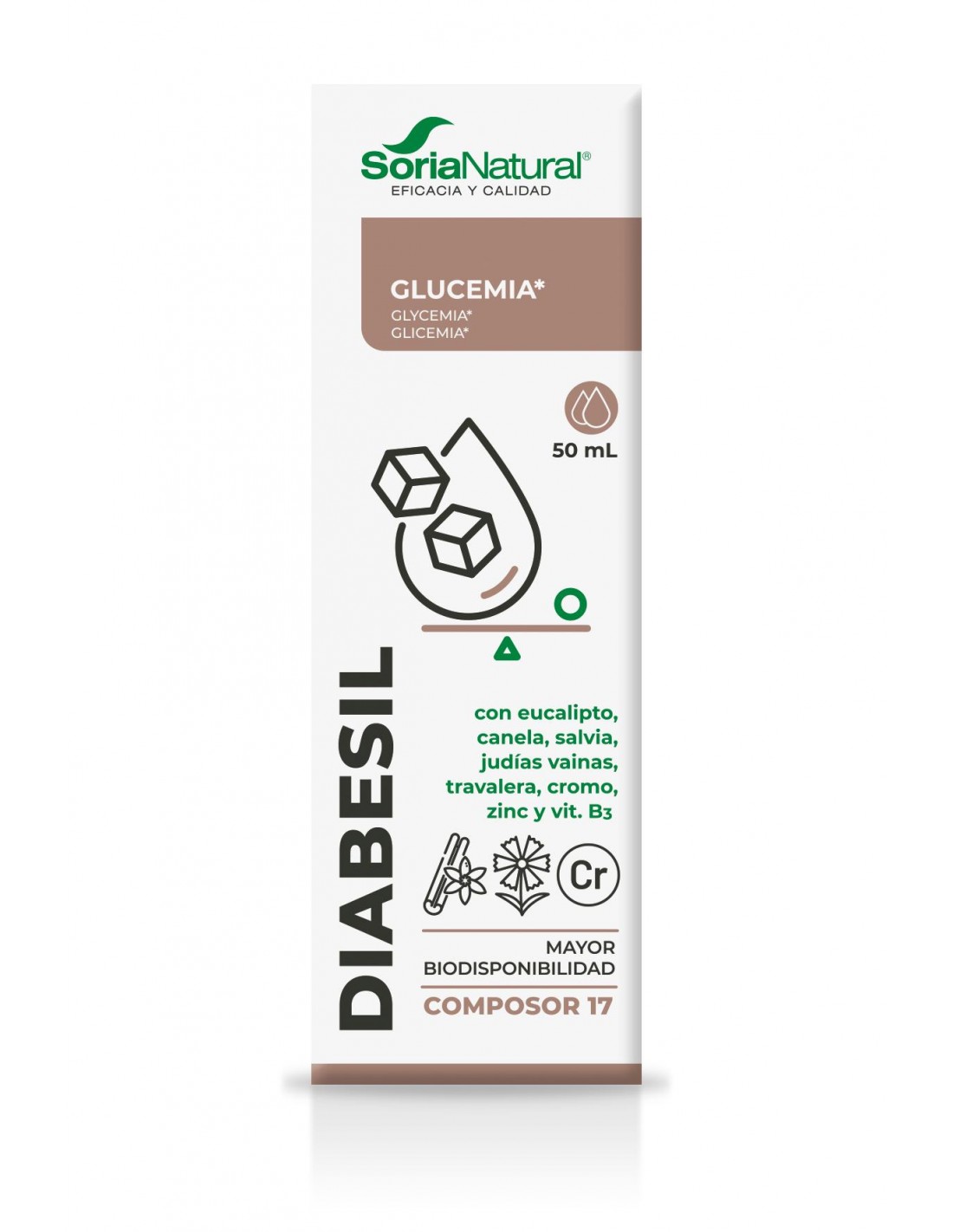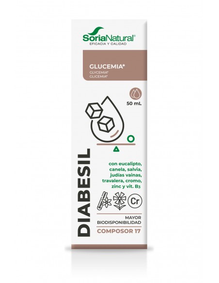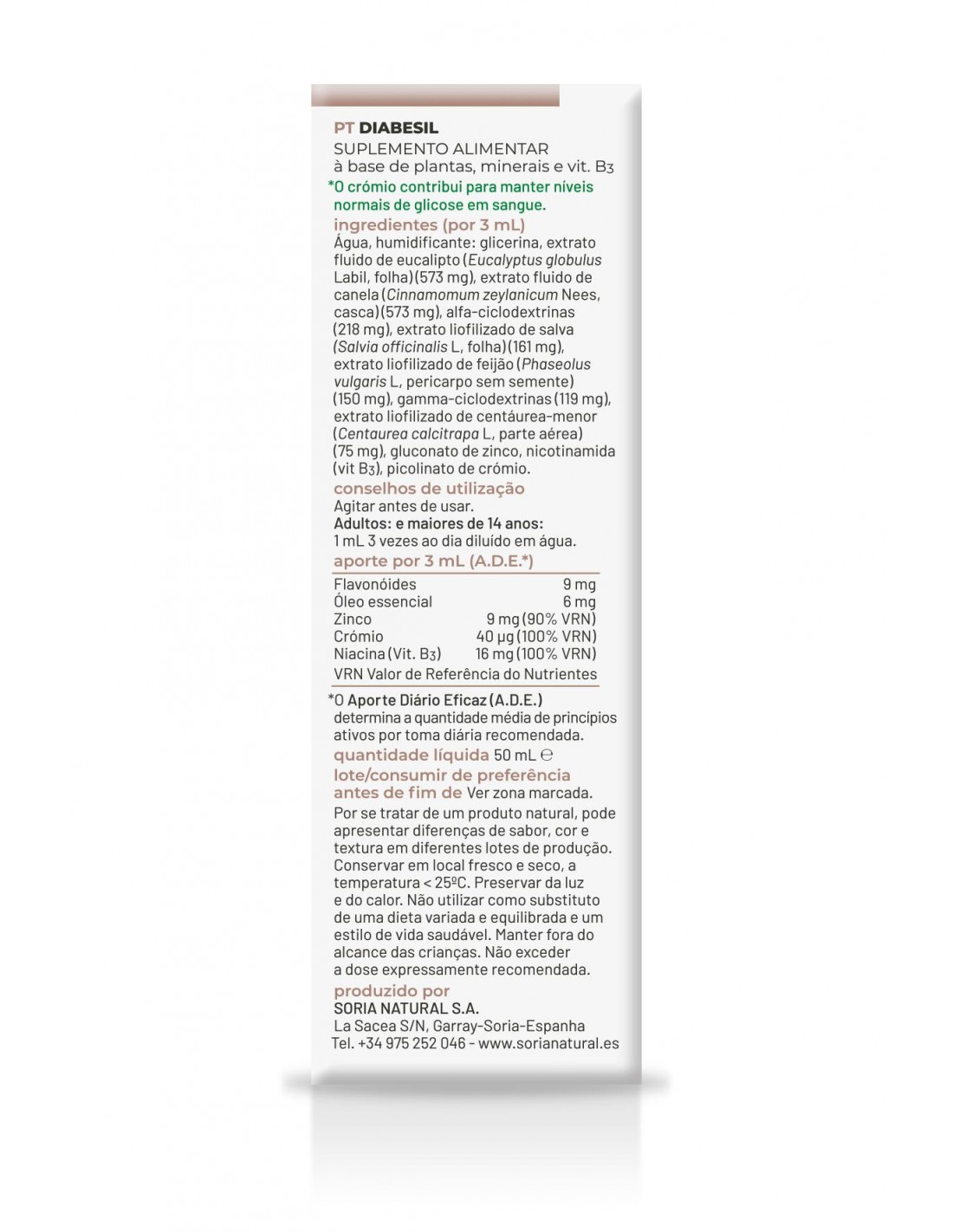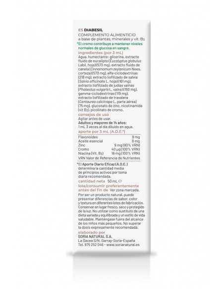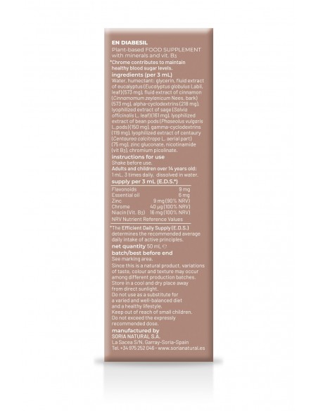 (por 3 mL) Agua, humectante: glicerina, extracto fluido de Eucalipto (Eucalyptus globulus Labil, hoja) (573 mg) , extracto fluido de Canela (Cinnamomum zeylanicum Nees, corteza) (573 mg) , alfa-ciclodextrinas (218 mg), extracto liofilizado de Salvia (Salvia officinalis L. , hoja) (161 mg), extracto liofilizado de Judías vainas (Phaseolus vulgaris L., vaina) (150 mg), gamma-ciclodextrinas (119 mg), extracto liofilizado de travalera (Centaurea calcitrapa L., parte aérea) (75 mg), gluconato de zinc, nicotinamida (vit B3), picolinato de cromo.