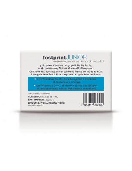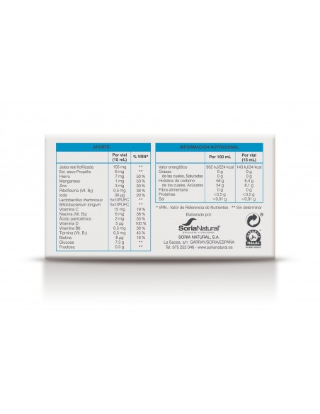 Vial: Agua, glucosa, fructosa, correcotr de acidez: ácido cítrico, sulfato ferroso, jalea real, aromas, ácido L-ascórbico (Vit. C), conservador: sorbato potásico, gluconato de manganeso, sulfato de zinc, riboflavina (Vit. B2), yoduro potásico.