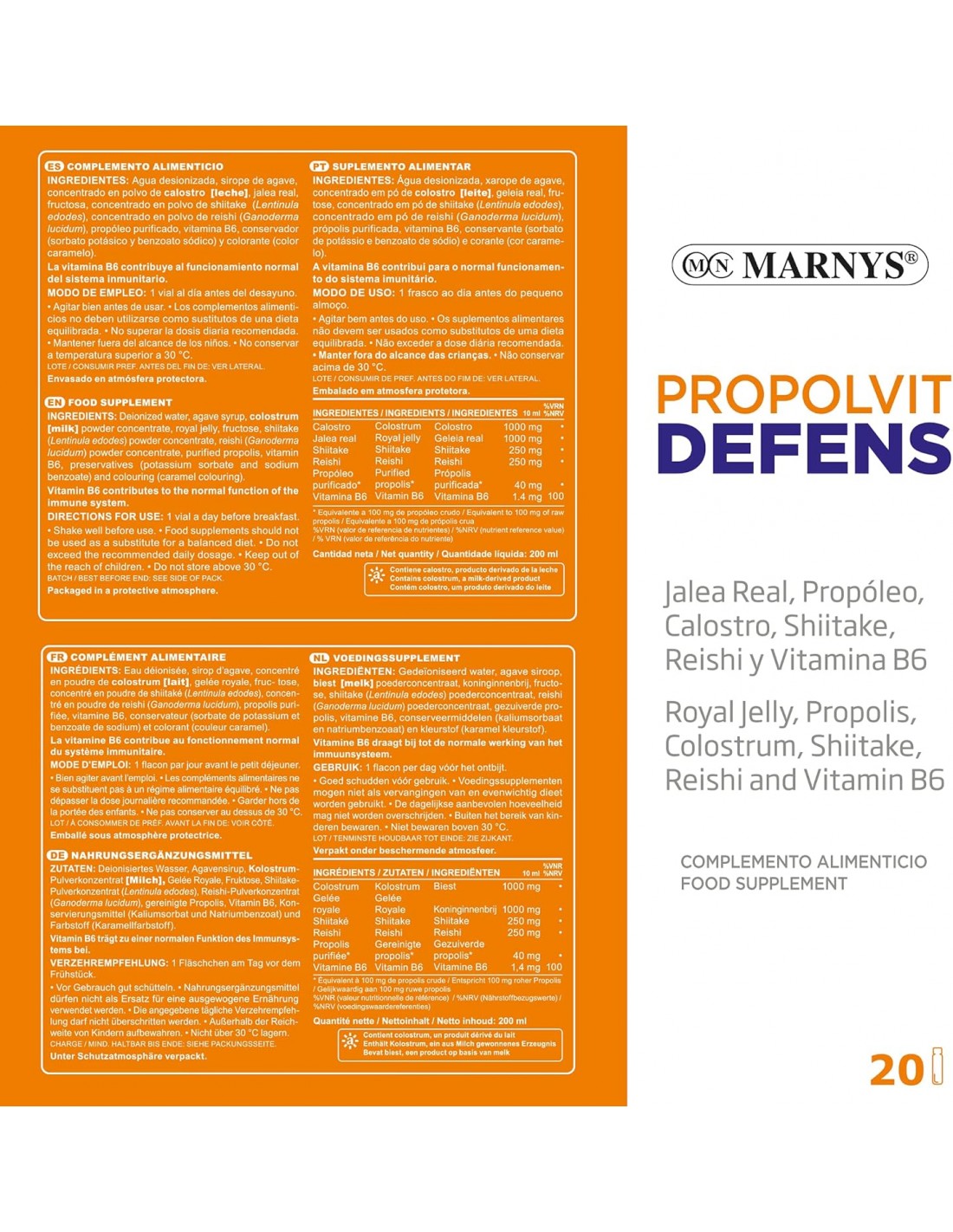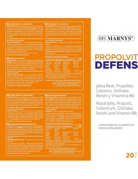 Agua desionizada, sirope de ágave, Colostrum, jalea real, fructosa, concentrado en polvo de shiitake (Lentinula edodes), concentrado en polvo de reishi (Ganoderma lucidum), clorhidrato de piridoxina (vitamina B6), conservadores (sorbato potásico y benzoato sódico) y colorante (color caramelo).