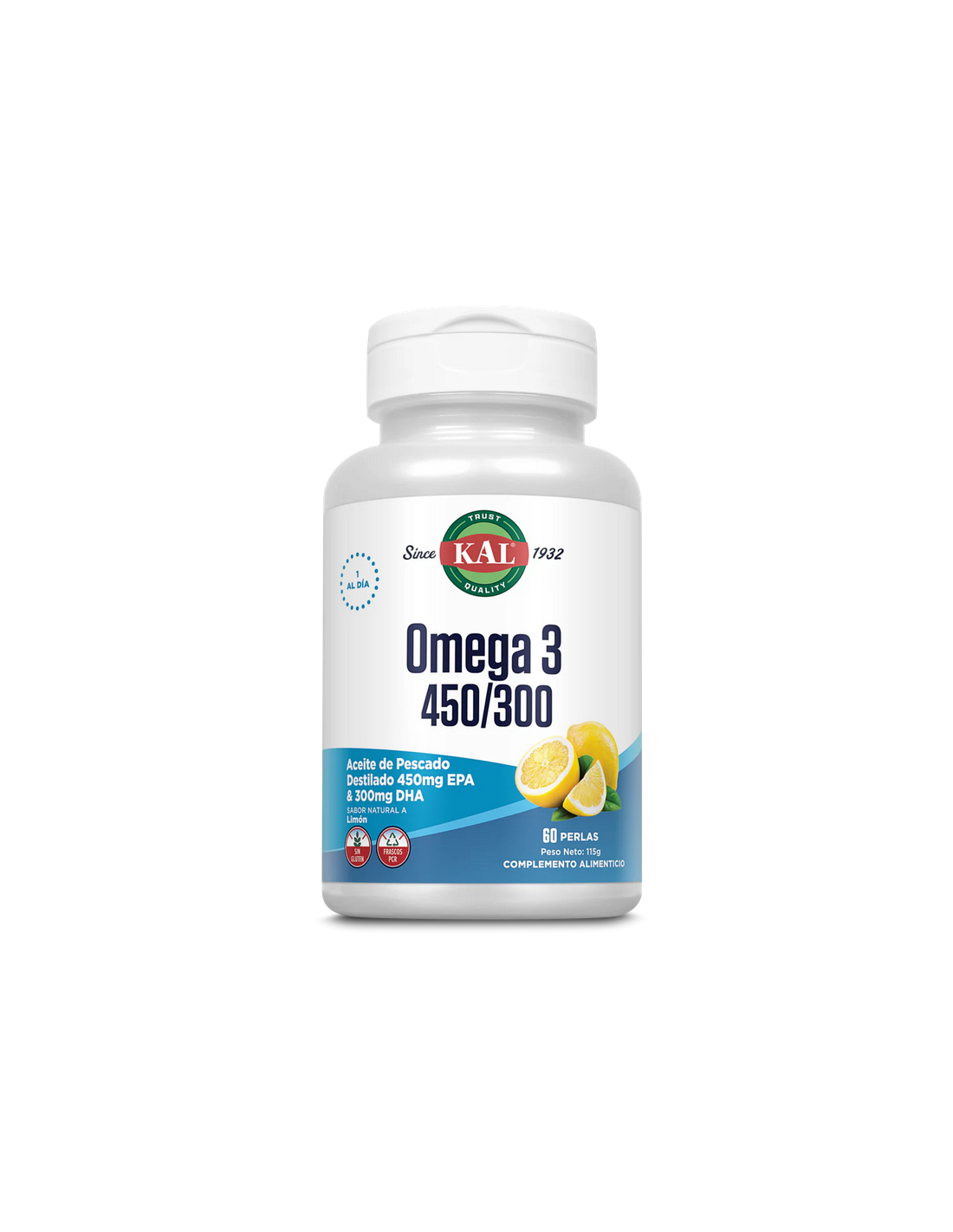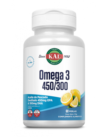 El complemento nutricional Omega 3 450/300 de Kaltiene sabor natural a limón,con ácidos grasos esenciales que apoyan al cuerpo. Contiene EPA y DHA, dos tipos de ácidos grasos Omega-3 que contienen múltiples propiedades para ayudar al normal funcionamiento del cerebro, el corazón y la piel. Además, estos ácidos grasos pueden ayudar al bienestar emocional, a regular el humor y a la normal respuesta emocional ante el estrés. Puede ser de ayuda para las personas que sufren de alteraciones estacionales del estado de ánimo. Los ácidos grasos de Omega 3 Kal, EPA y DHA se encuentran naturalmente en los alimentos de origen marino, como el pescado, pero también están disponibles en forma de suplementos. El EPA es conocido por ayudar a mantener el sistema cardiovascular en condiciones normales. Por otro lado, el DHA puede ayudar al desarrollo y la función del cerebro y la vista.