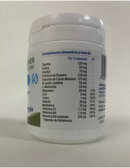 Bitartrato de colina, hidróxido de magnesio, extracto estandarizado de cardo mariano (Silybum marianum L. Gaertn., 80% silimarina), extracto estandarizado de romero (Rosmarinus officinalis L., 50% ácido ursólico), taurina, almidón de patata, inositol, N-Acetil-Cisteina, citrato de zinc, L-metionina, antiaglomerante: estearato de magnesio, gluconato de cobre, Piridoxal-5´-Fosfato (vitamina B6), Clorhidrato de Tiamina (vitamina B1), molibdato de sodio, selenita de sodio, L-Metilfolato de calcio (vitamina B9), Metilcobalamina (vitamina B12).