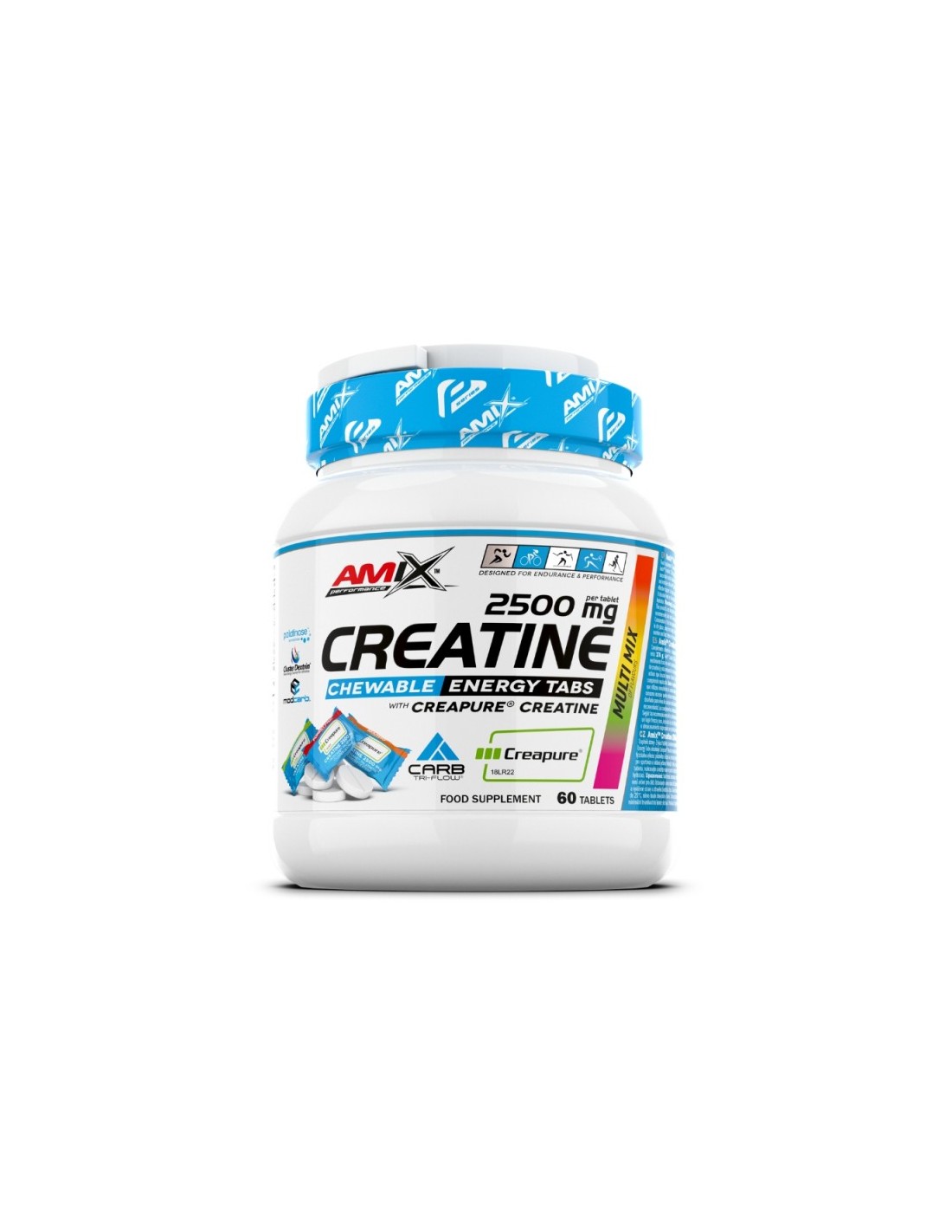 Ingredientes: Creapure® – monohidrato de creatina, aglutinantes: sorbitol, dextratos; complejo Amix™ Carb Tri-Flow 2,2 % (isomaltulosa /Palatinose™/ – fuente de glucosa y fructosa, dextrina cíclica altamente ramificada Cluster DextrinR, ModCarb™ /salvado de avena sin gluten, quinoa, amaranto, trigo sarraceno, mijo/), regulador de acidez: ácido málico; lubricante: mono y diglicéridos de ácidos grasos; aroma, edulcorante: sucralosa.