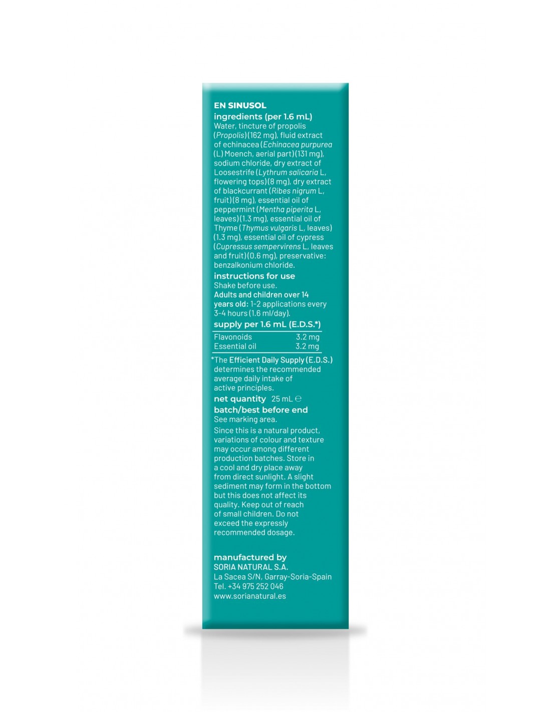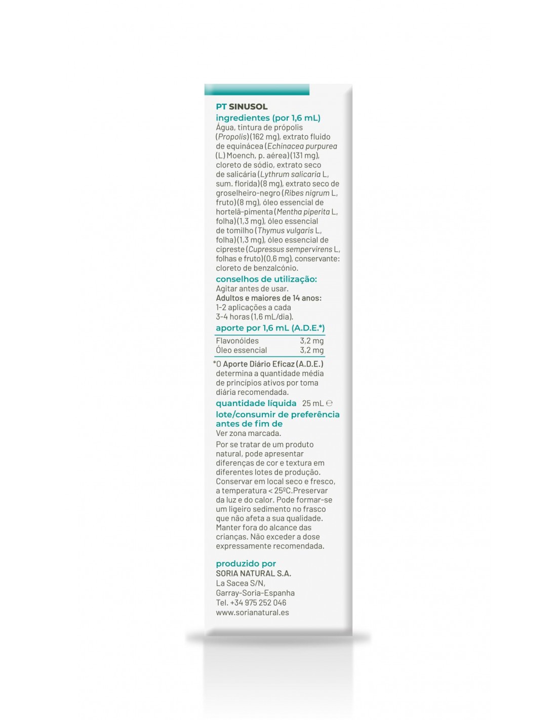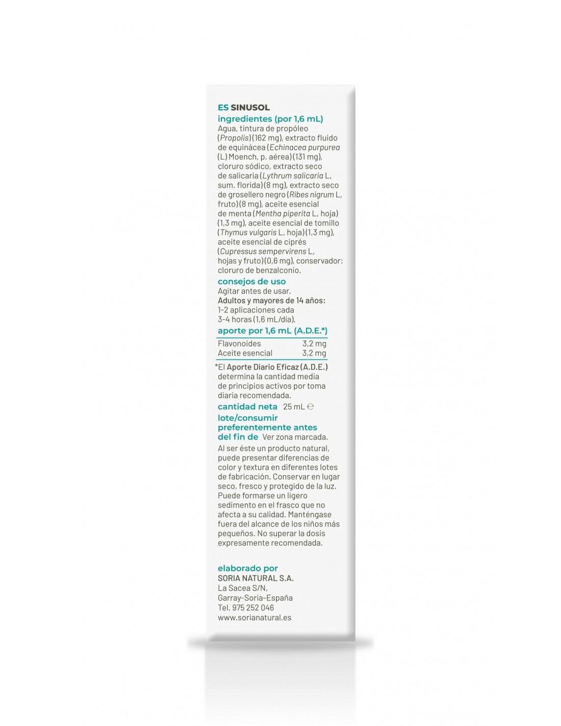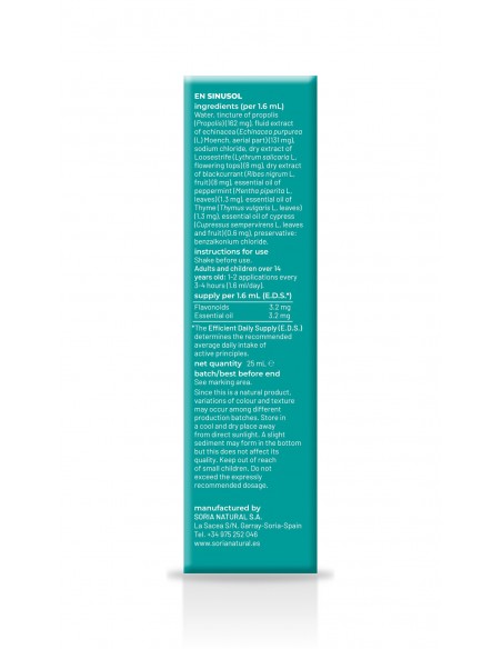 (por 1,6 mL) Agua, tintura de Propóleo (Própolis) (162 mg), extracto fluido de equinácea (Echinacea purpurea (L) Moench, p. aérea) (131 mg), cloruro sódico, extracto seco de salicaria (Lythrum salicaria L, sum. florida) (8 mg), extracto seco de grosellero negro (Ribes nigrum L, fruto) (8 mg), aceite esencial de menta (Mentha x piperita L, hoja) (1,3 mg), aceite esencial de tomillo (Thymus vulgaris L, hoja) (1,3 mg), aceite esencial de ciprés (Cupressus sempervirens L., hojas y fruto) (0,6 mg), conservador: cloruro de benzalconio.