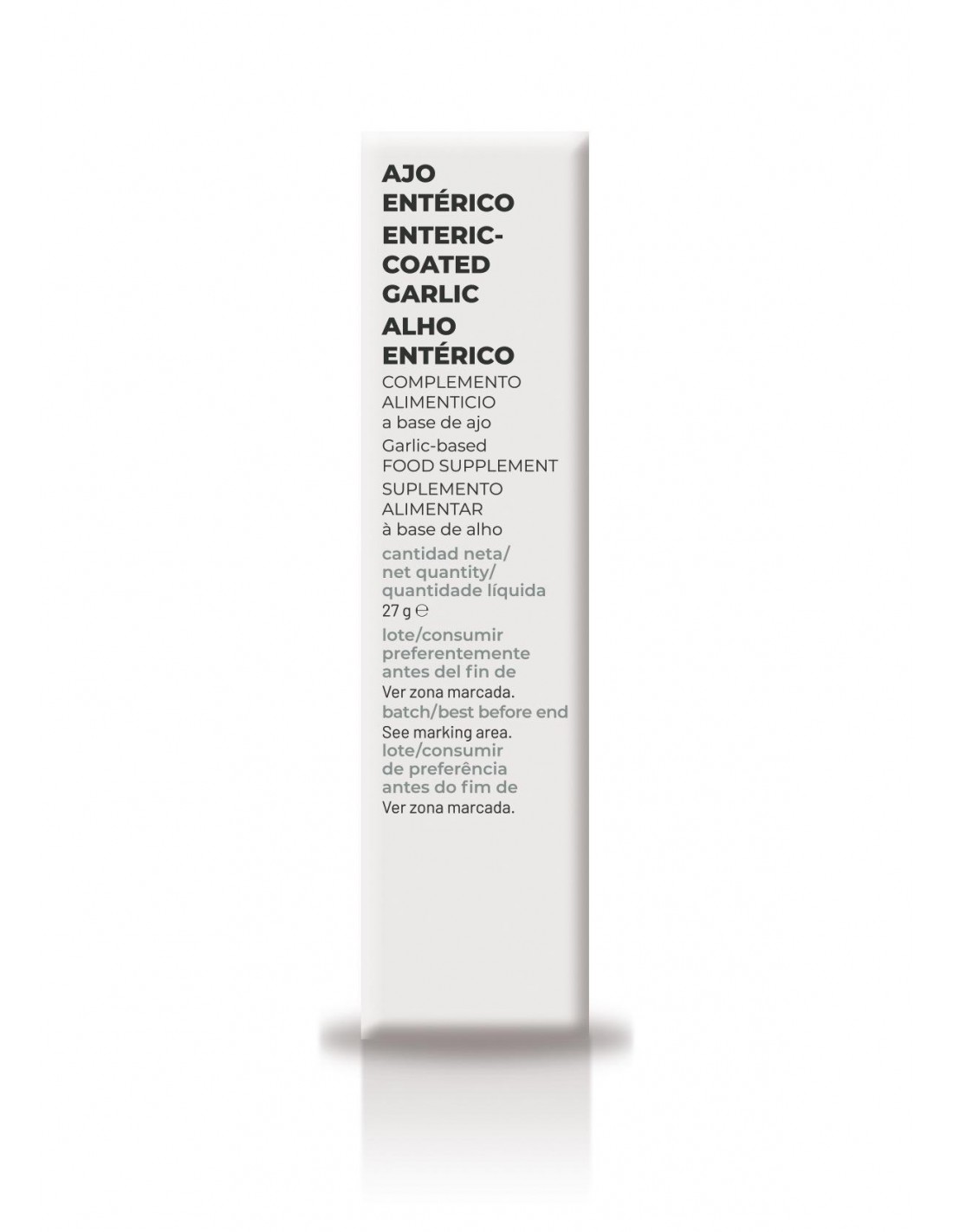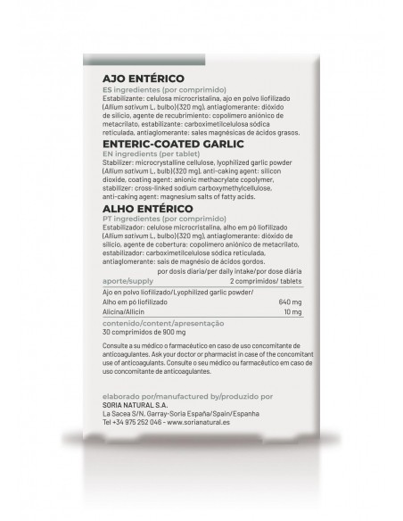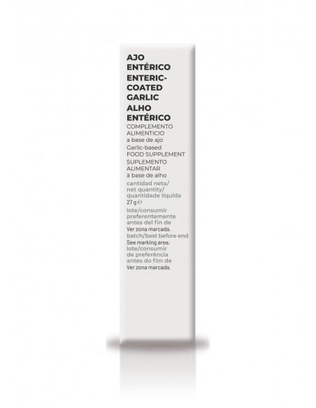 (por comprimido) Estabilizante: celulosa microcristalina, ajo en polvo liofilizado (Allium sativum L, bulbo) (320 mg), antiaglomerante: dióxido de silicio, agente de recubrimiento: copolímero aniónico de metacrilato, estabilizante: carboximetilcelulosa sódica reticulada, antiaglomerante: sales magnésicas de ácidos grasos.