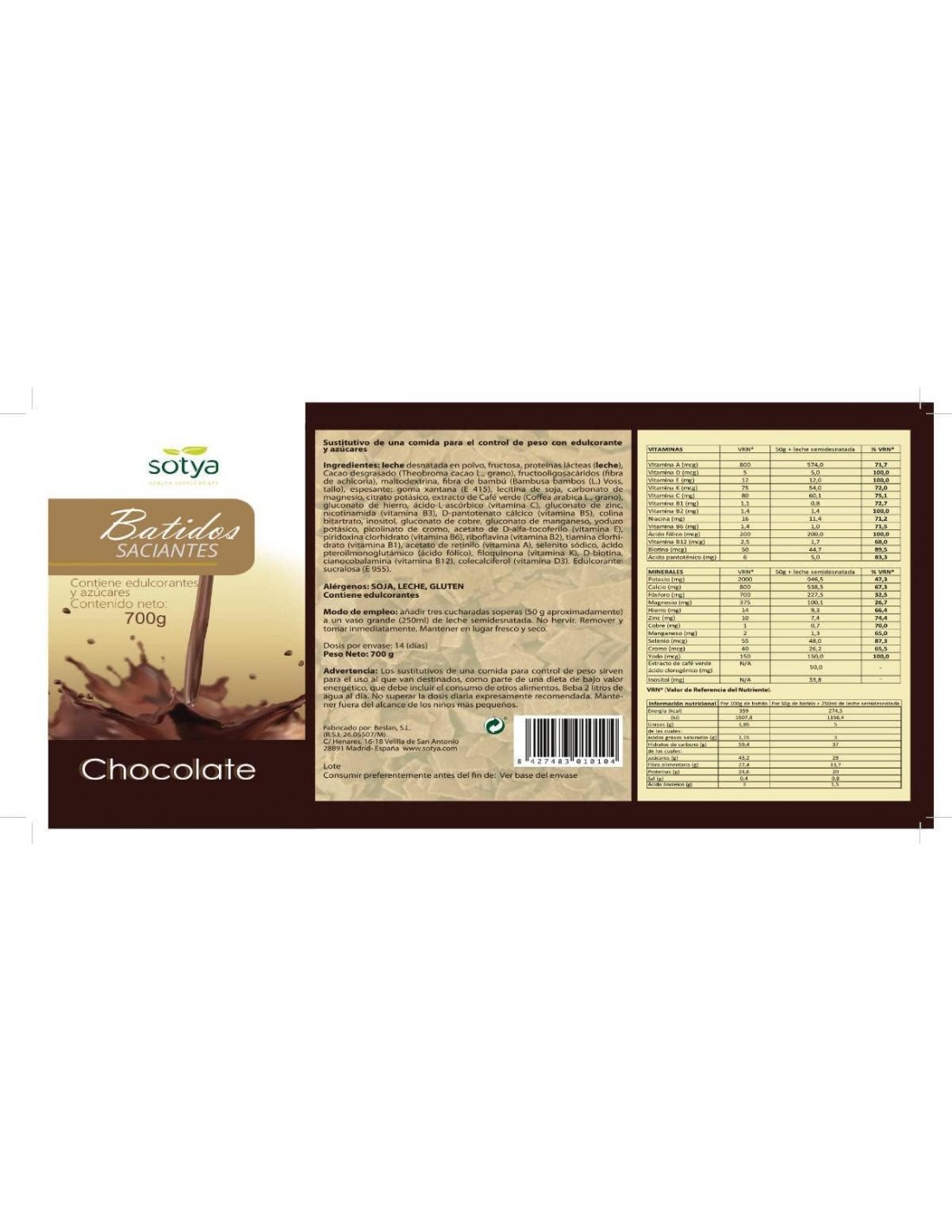 Batido saciante (Sabor Chocolate) de Sotya, complemento dietético diseñado como sustitutivo de una comida en dietas de pérdida de peso.